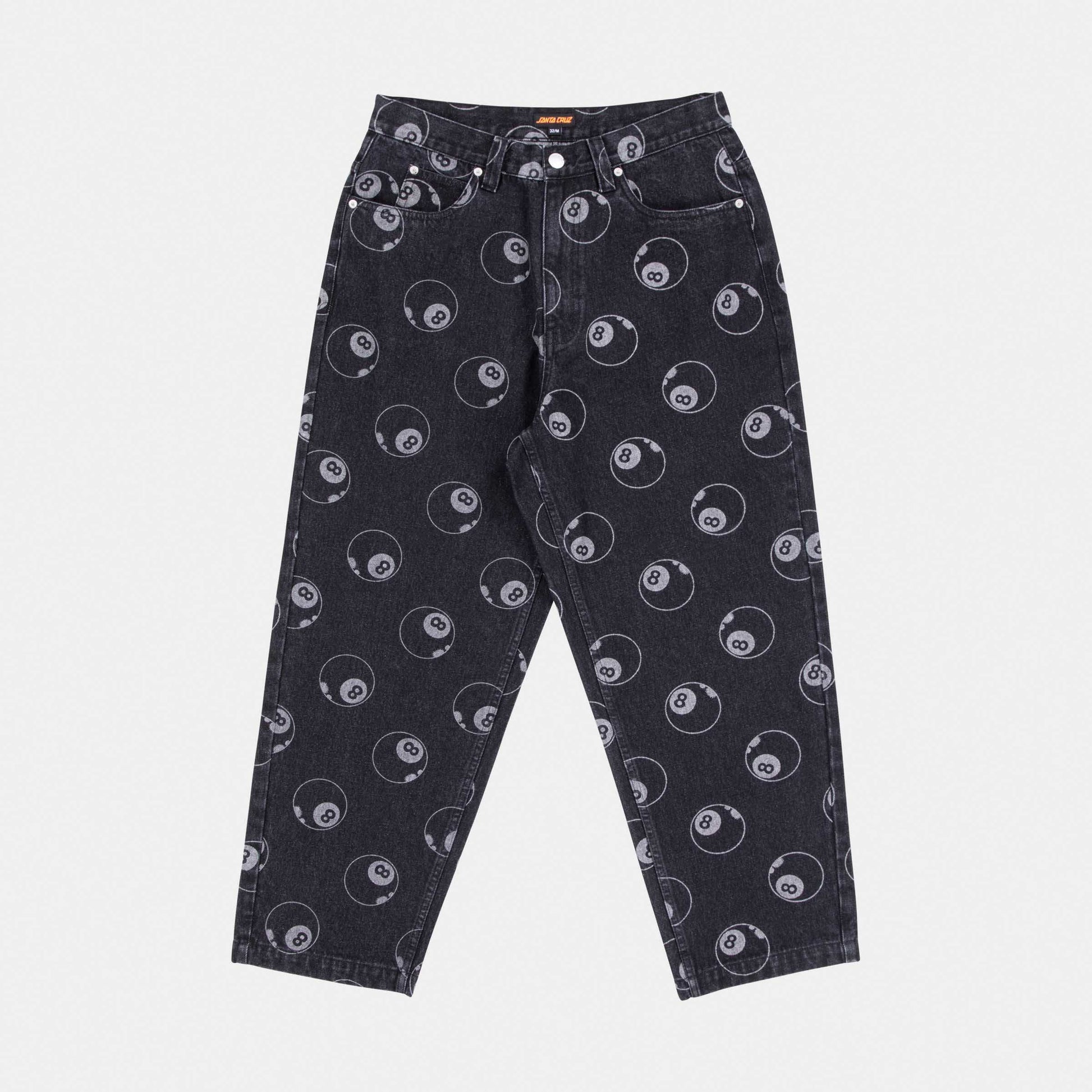 Dark Cherry: Overdyed denim, Eighth Planet/Jaguar: all over discharge print, Black Wash/Mid Blue: 94% cotton, 6% polyester, 13.5oz denim, baggy fit pant with front pockets, back pockets and woven label branding Size 34, Inseam - 30" / Leg opening - 9 1/8"
