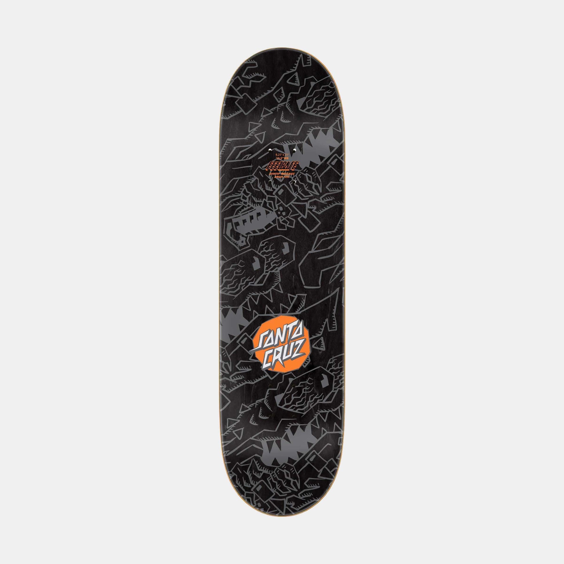 Santa Cruz Keith Meek Scratched Slasher FeelBase deck with 13.5" wheelbase, and spot matte metallic graphics on black stained veneer.