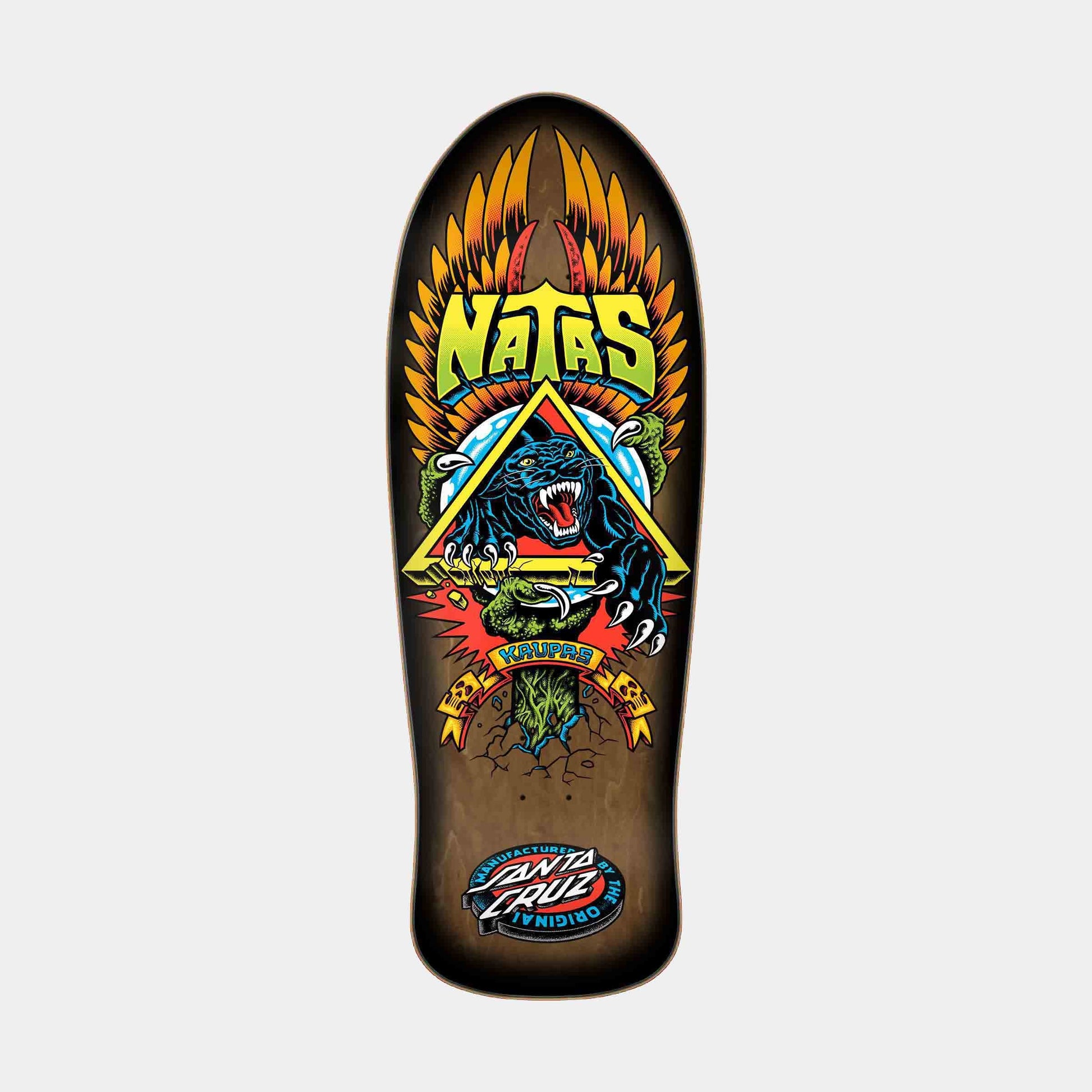 The Santa Cruz Skateboards Natas Kaupas SC Panther Reissue deck with reimagined and remastered spot matte graphics on brown stained veneer with black sunburst fade, and 2025 reissue laser decktop logo.