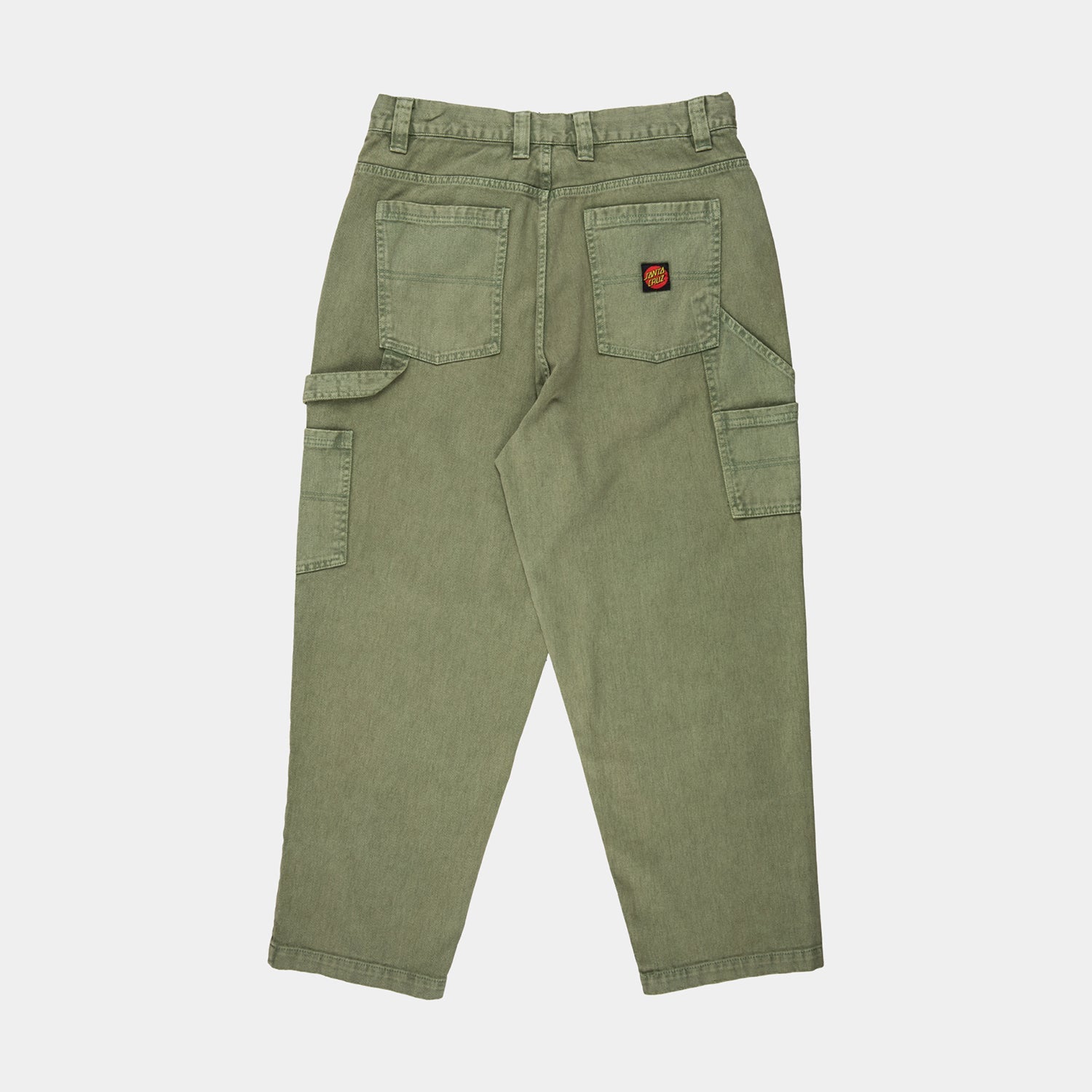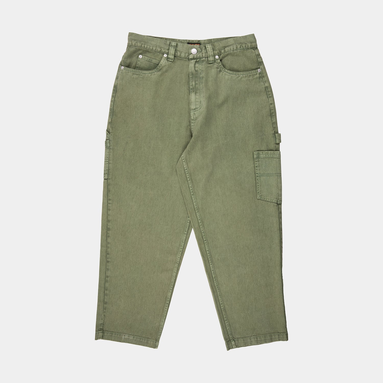 Iguana: 100% cotton twill, garment dyed, Stone Wash: 94% cotton, 6% polyester, 13.5oz denim, baggy fit jeans with front pockets, back pockets, hammer loop/pocket and woven label branding Size 34, Inseam - 30" / Leg Opening - 9 1/8"