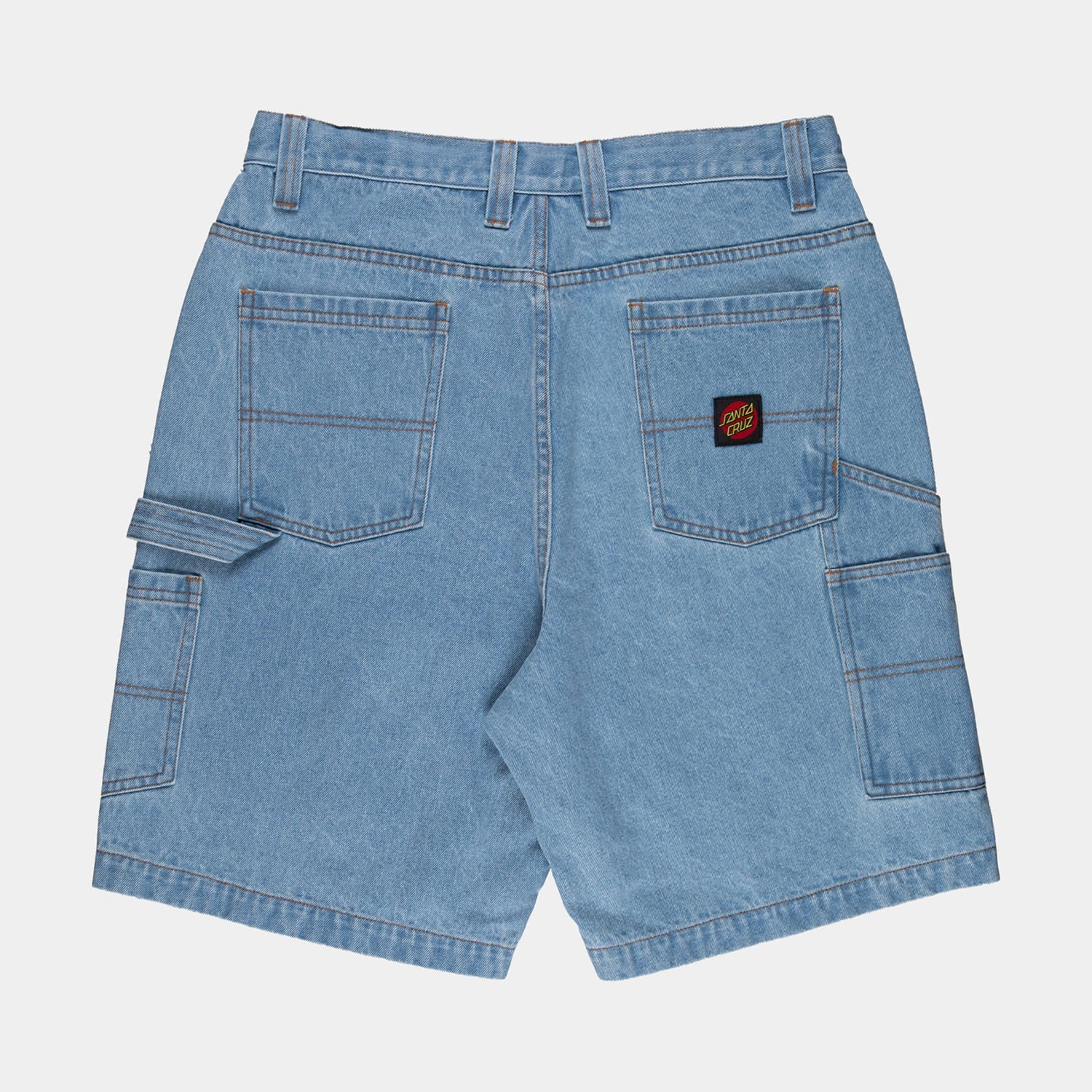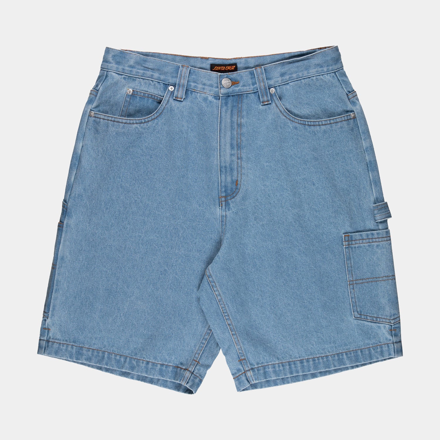 Stone Wash: 94% cotton, 6% polyester, 13.5oz denim, Tan: 65% cotton, 35% polyester, 10.58oz denim, baggy fit shorts with front pockets, back pockets, hammer loop/pocket and woven label branding