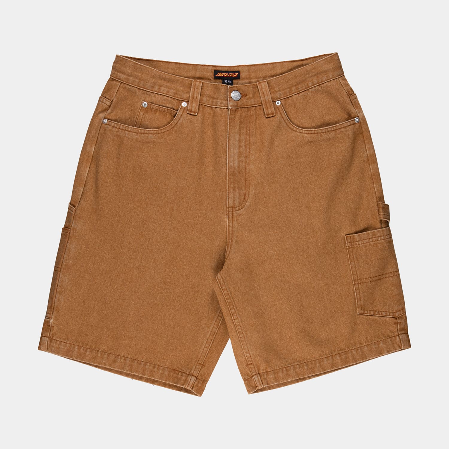 Stone Wash: 94% cotton, 6% polyester, 13.5oz denim, Tan: 65% cotton, 35% polyester, 10.58oz denim, baggy fit shorts with front pockets, back pockets, hammer loop/pocket and woven label branding