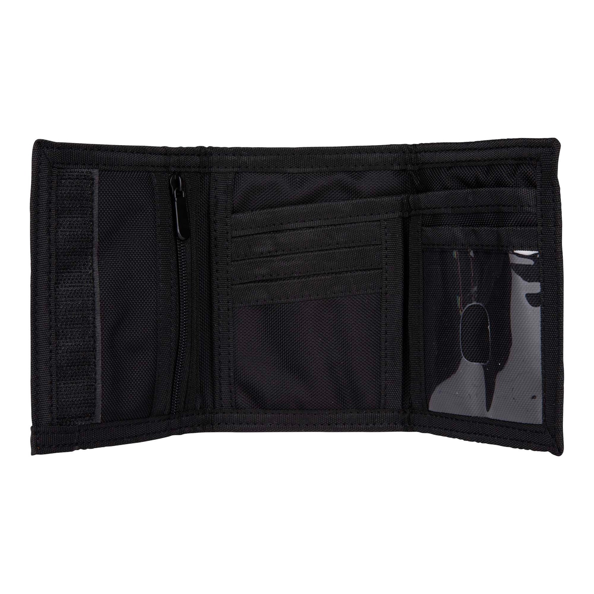 100% nylon, 840D tri-fold wallet, inside zip coin pocket, card and note slots with ID window, woven taping and front print