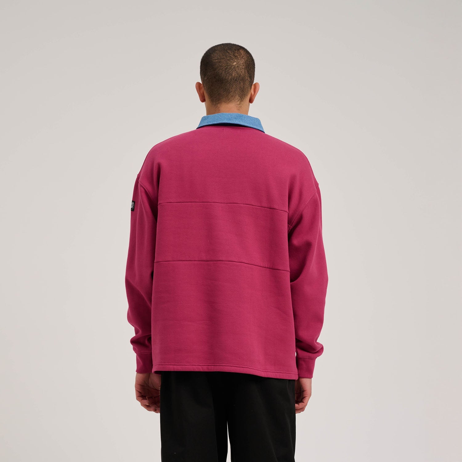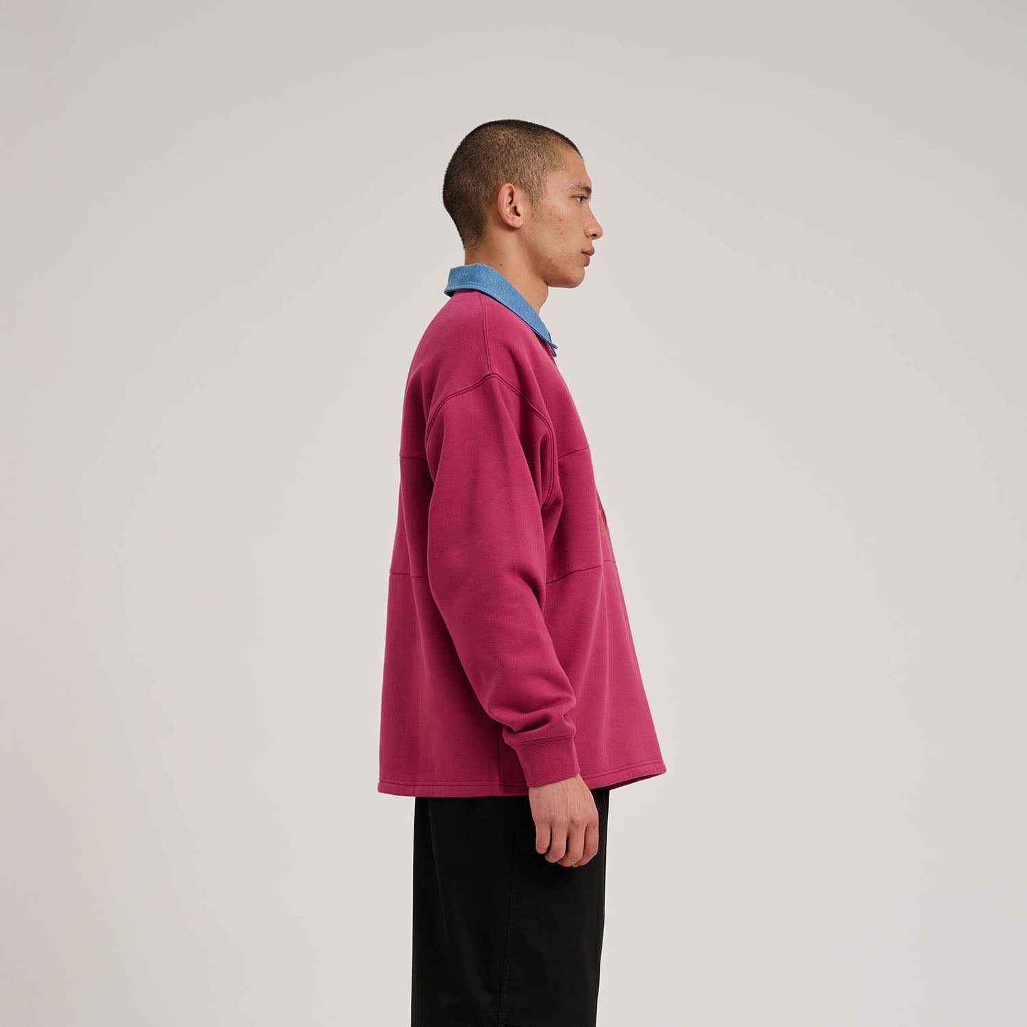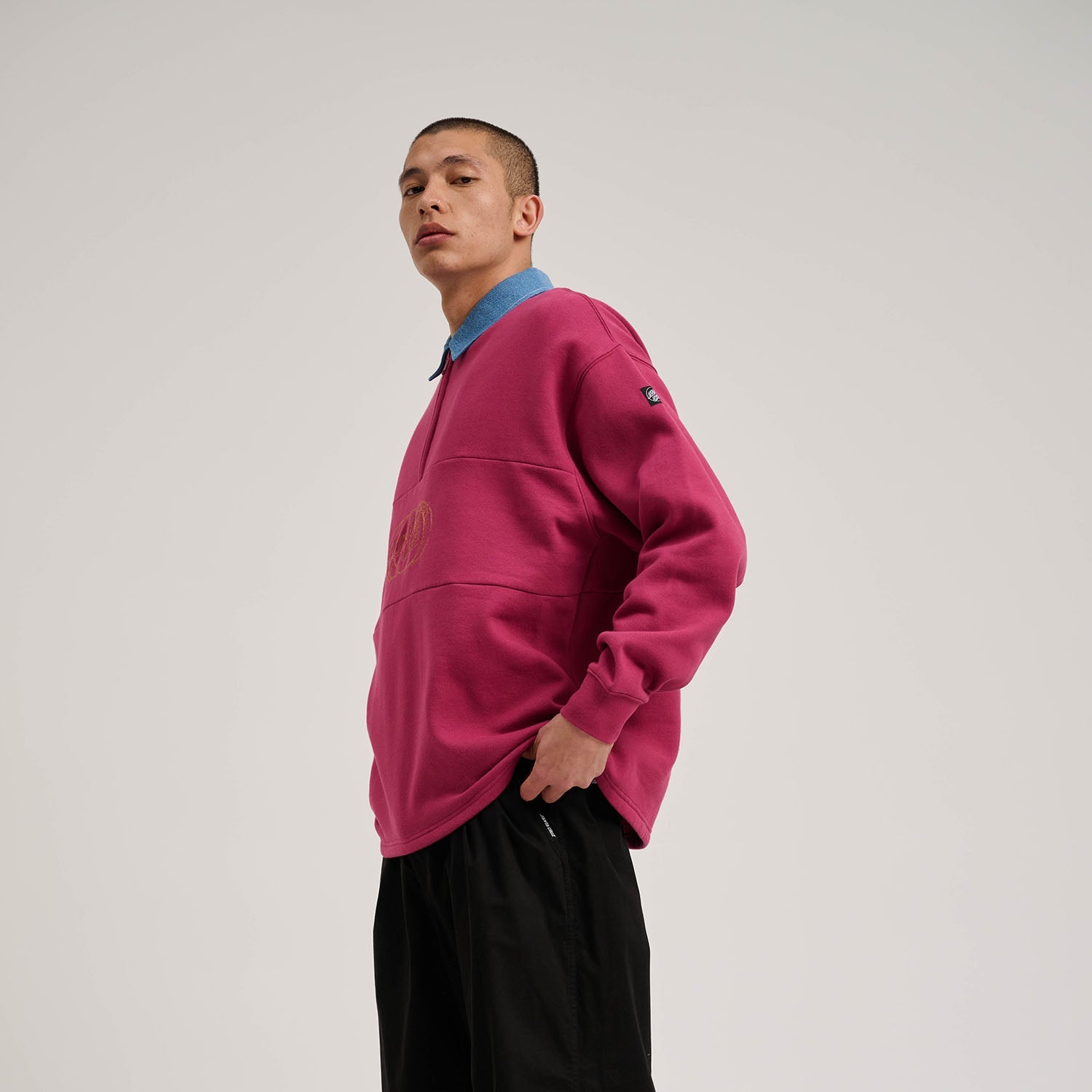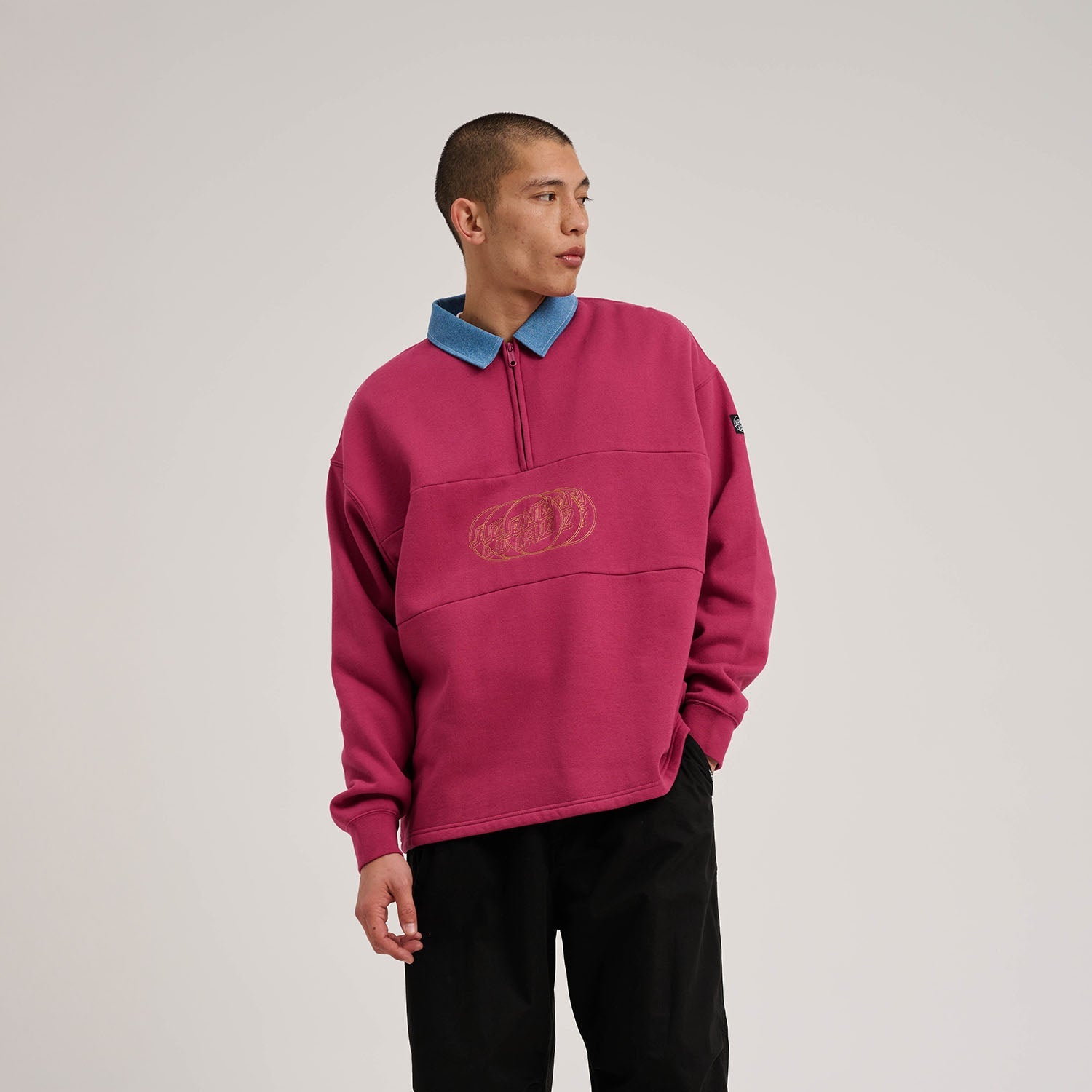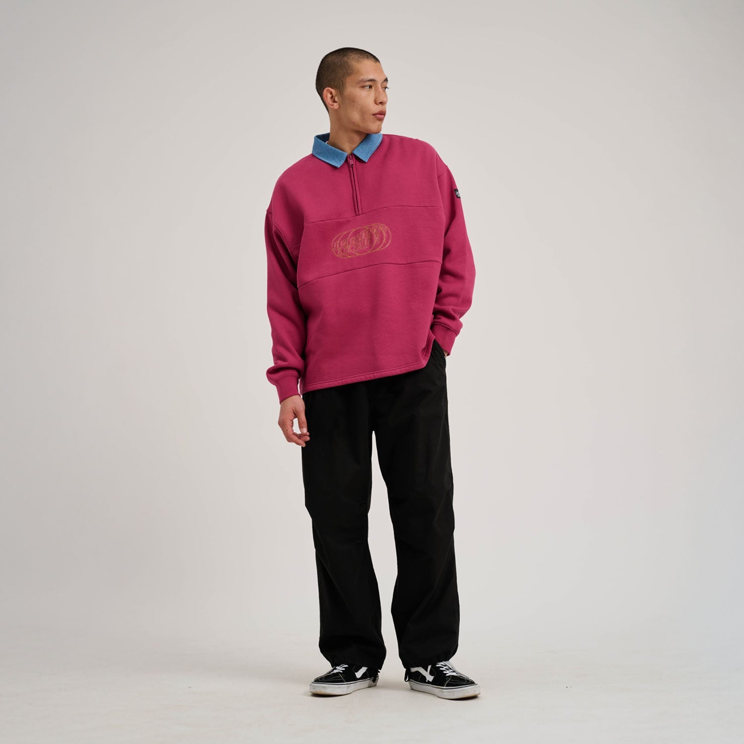 80% cotton, 20% polyester, 330gsm brushed fleece, boxy fit, zip polo crew sweatshirt with front panel, front embroidery and woven label branding at arm