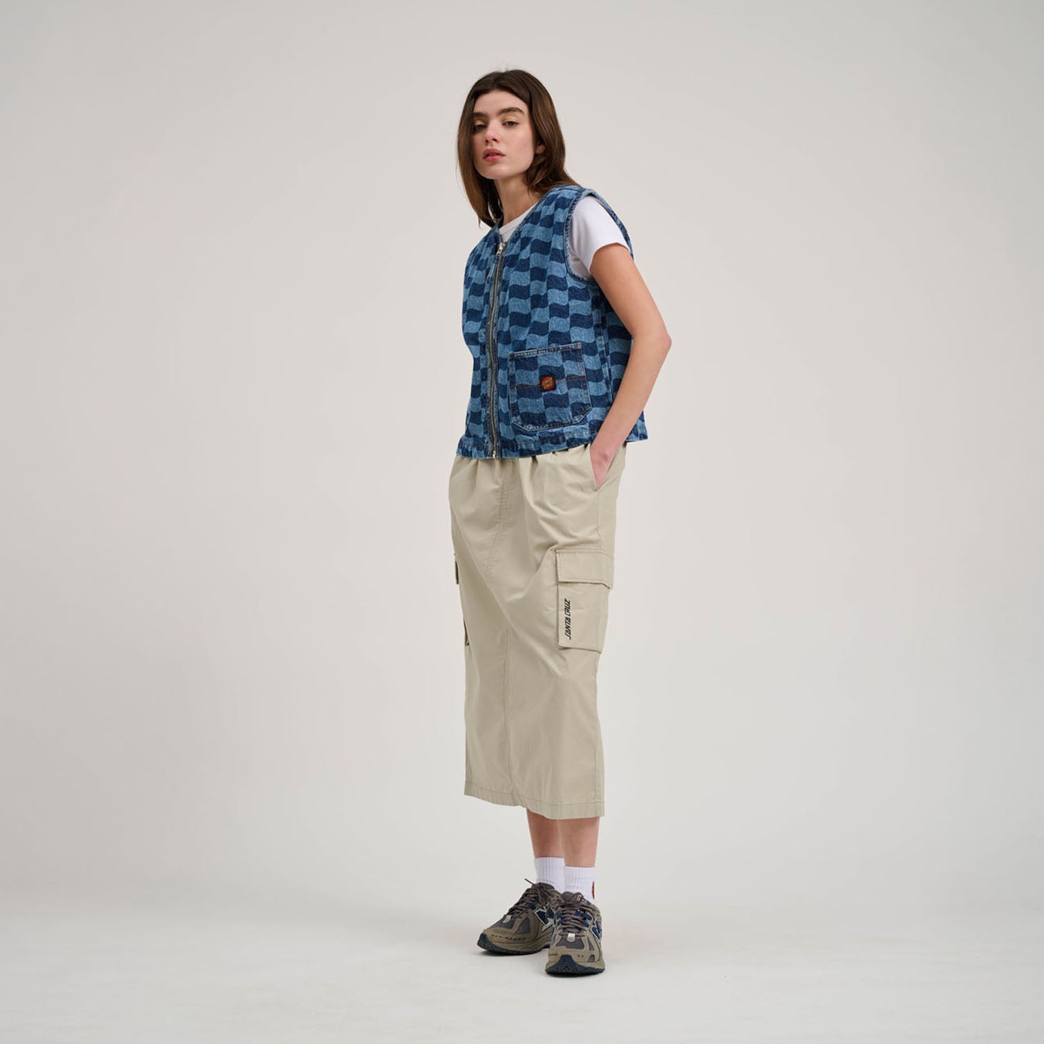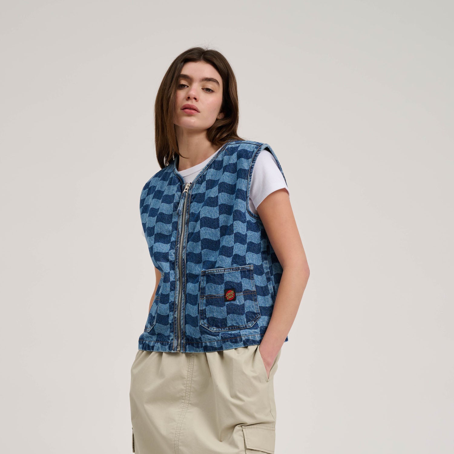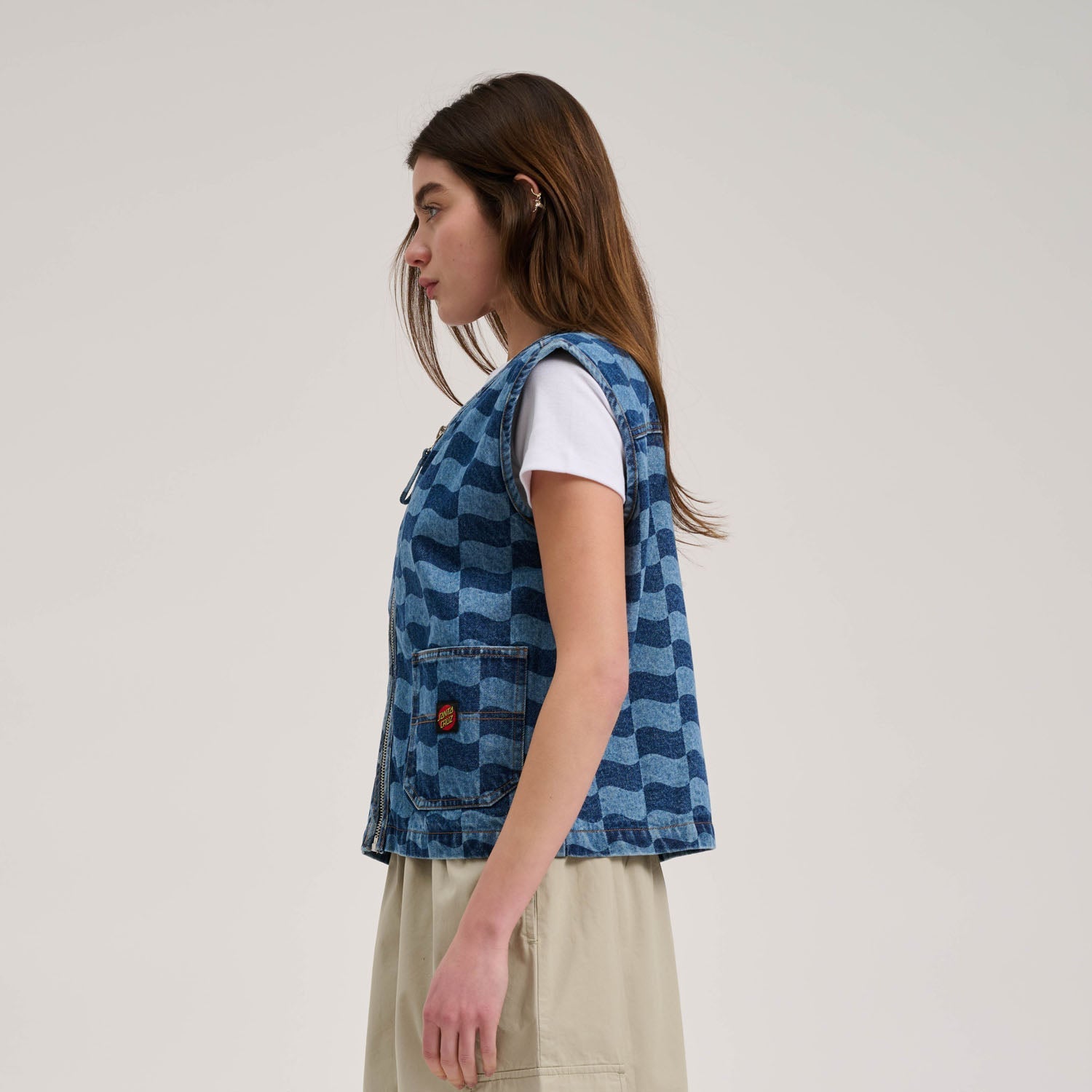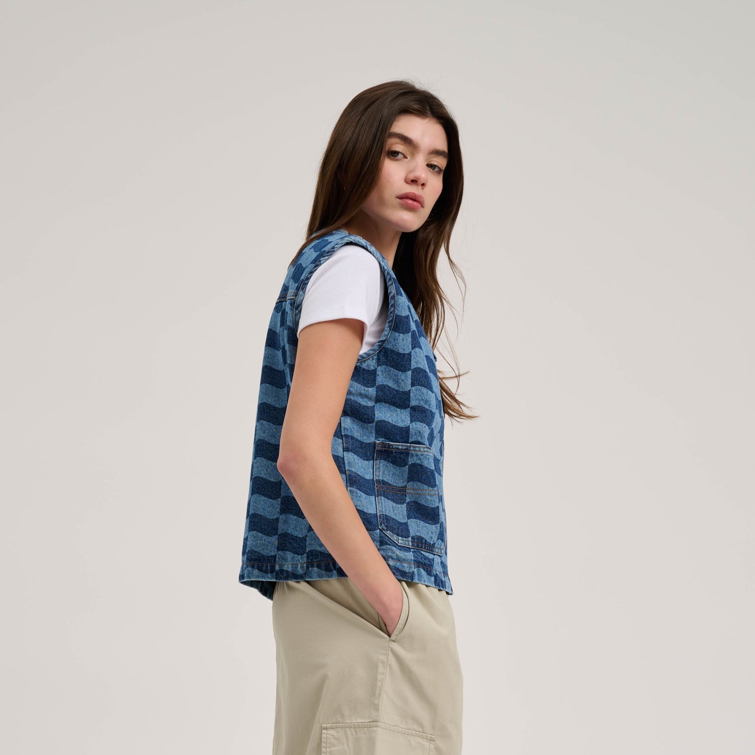 94% cotton, 6% polyester, 13.5oz denim, regular fit vest with front patch pockets, twin needle detailing, all over discharge print and woven label branding
