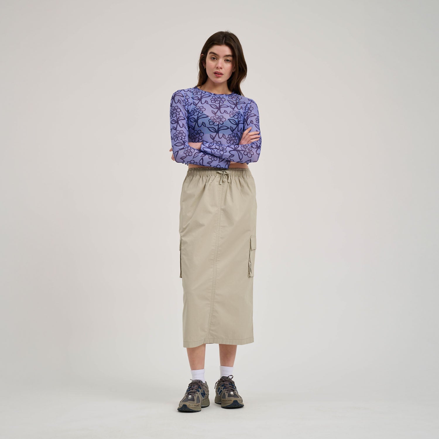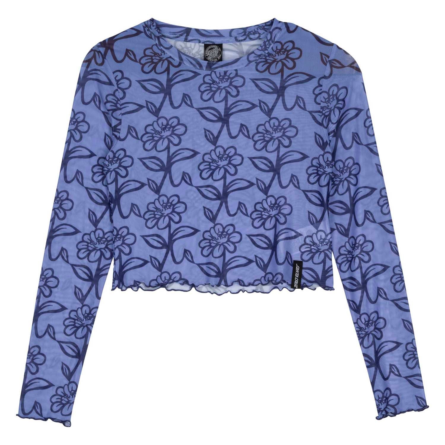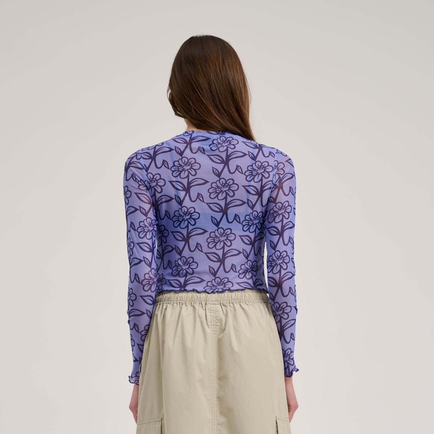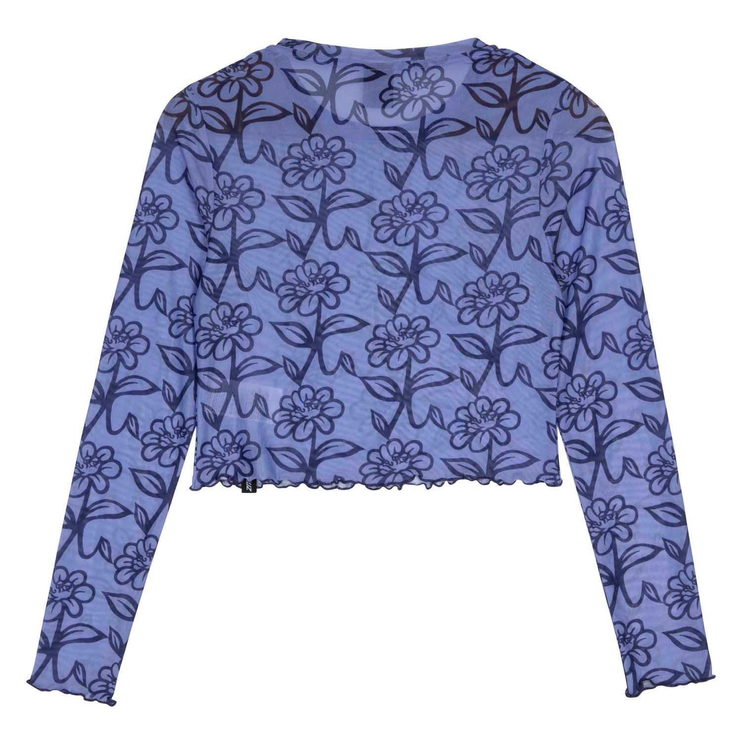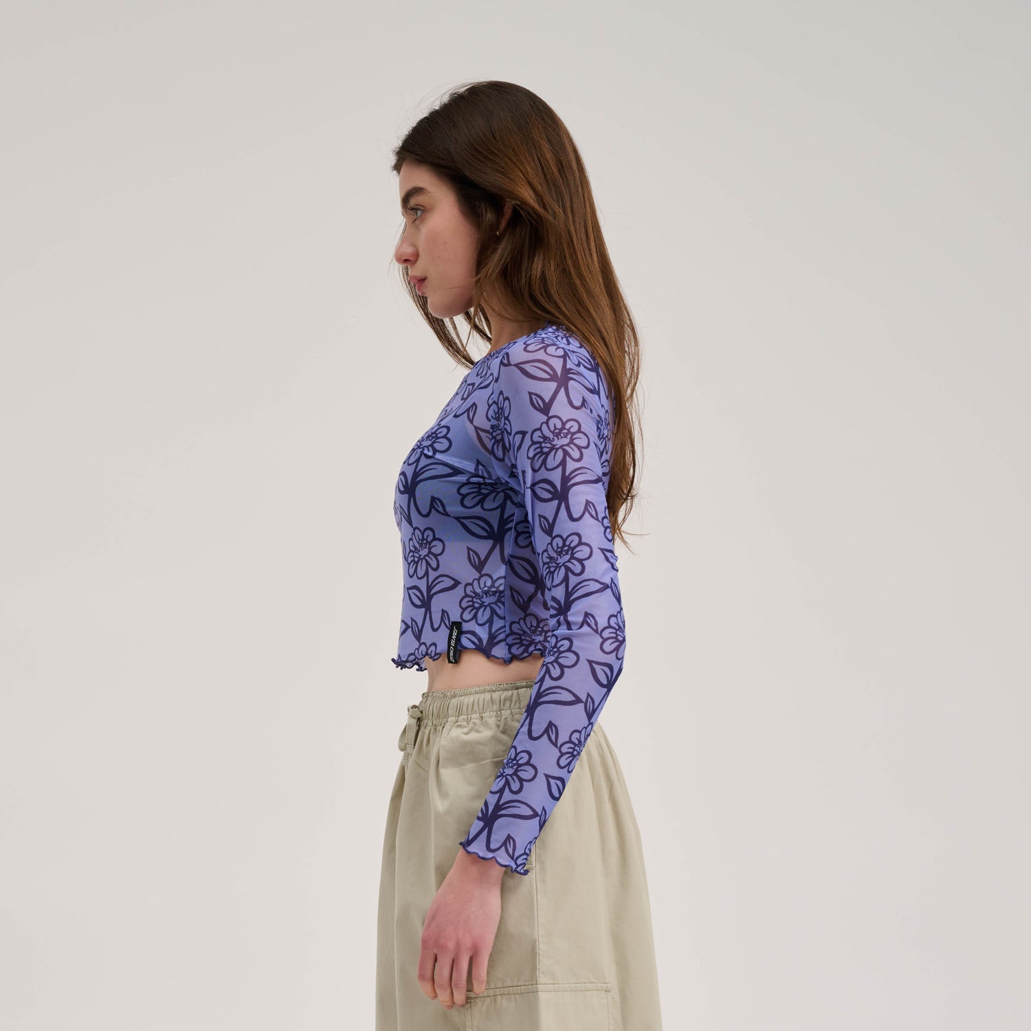100% polyester, mesh cropped longsleeve top with lettuce edge hems, all over sublimated print and woven label branding