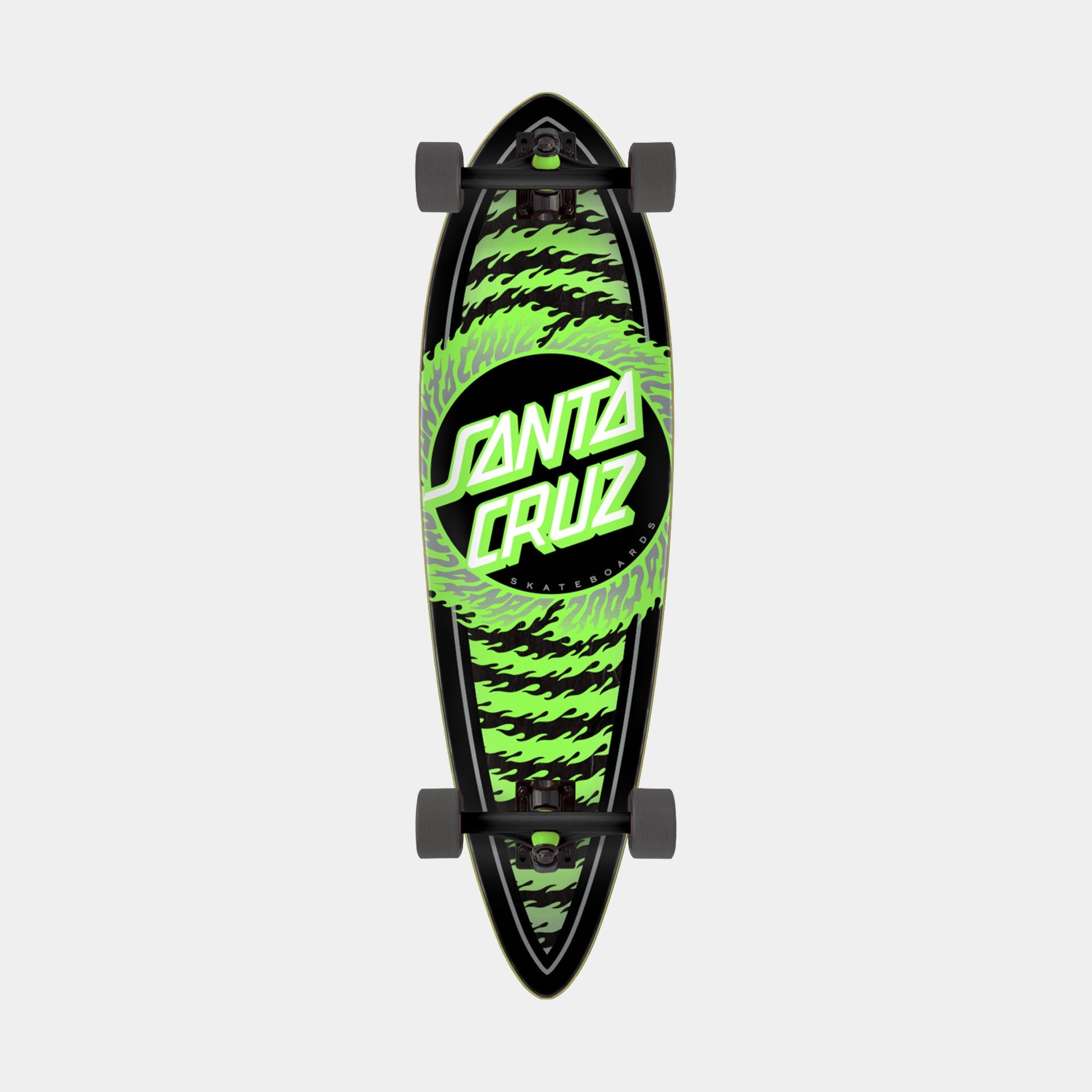 The Santa Cruz Skateboards Flame Ringed Dot Pintail Cruiser is ready to rip and features spot gloss graphics on small 9 ply pintail shaped deck with wheel wells, Bullet 160mm reverse kingpin trucks and transparent black Santa Cruz branded 60mm 78a Slime Balls wheels with metallic silver graphics.