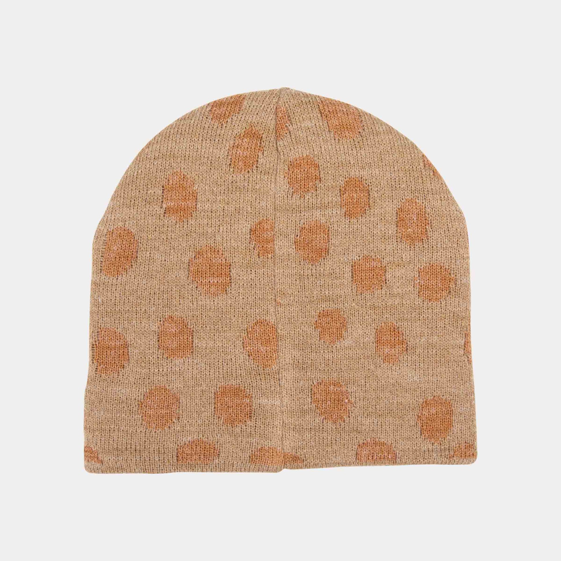 100% acrylic, fuzzy knit beanie with all over jacquard and woven label branding