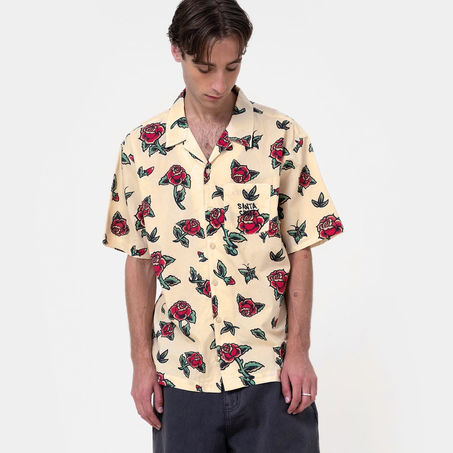 100% cotton poplin, boxy fit, short sleeve shirt with all over print and left chest pocket with embroidery