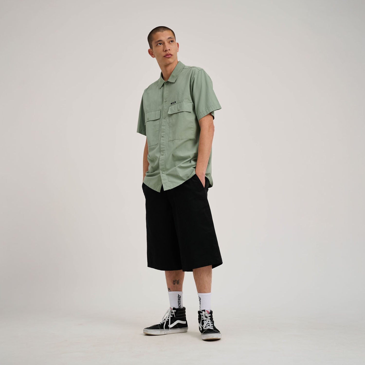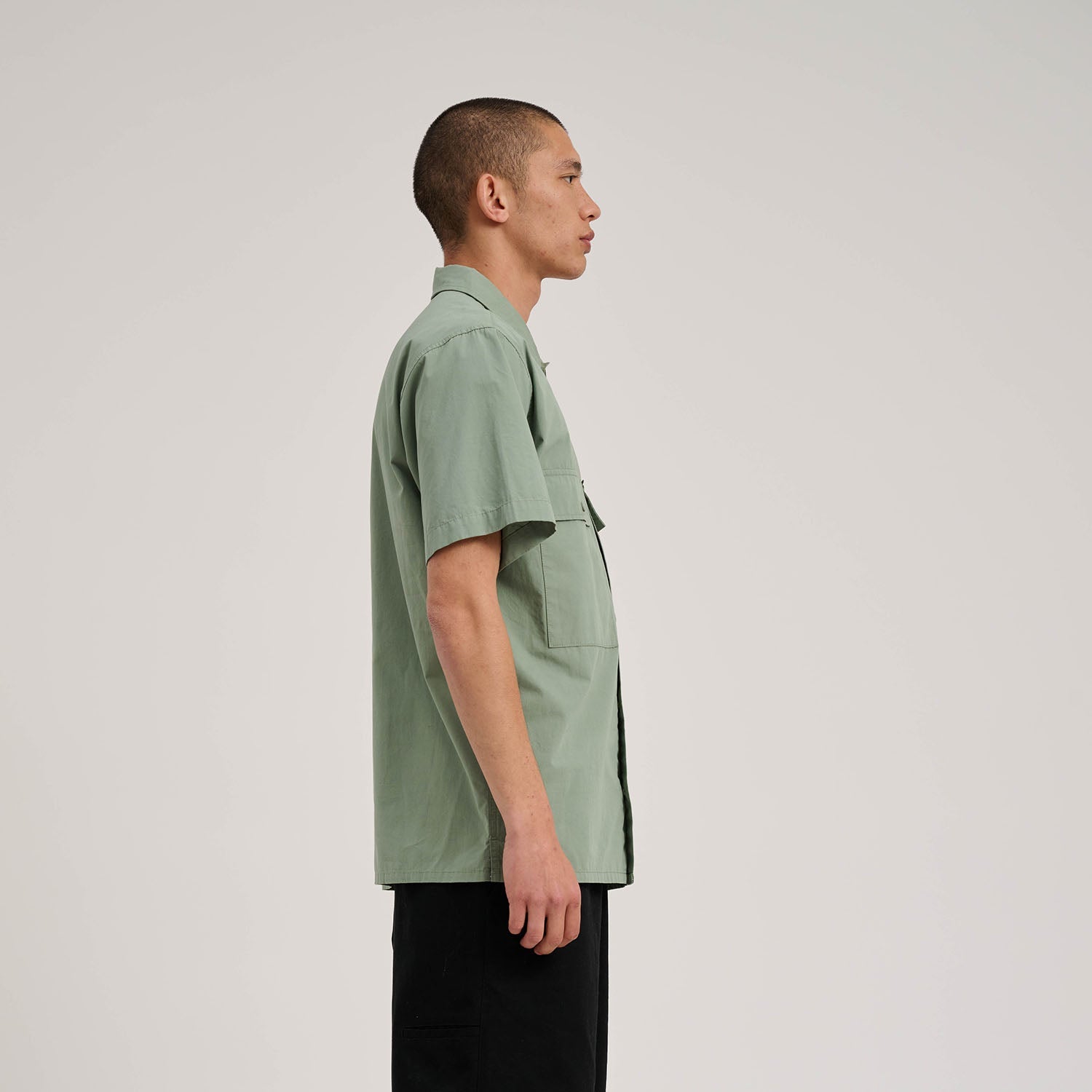 100% cotton, peach handfeel poplin, regular fit, short sleeve shirt with twin pockets and woven label branding