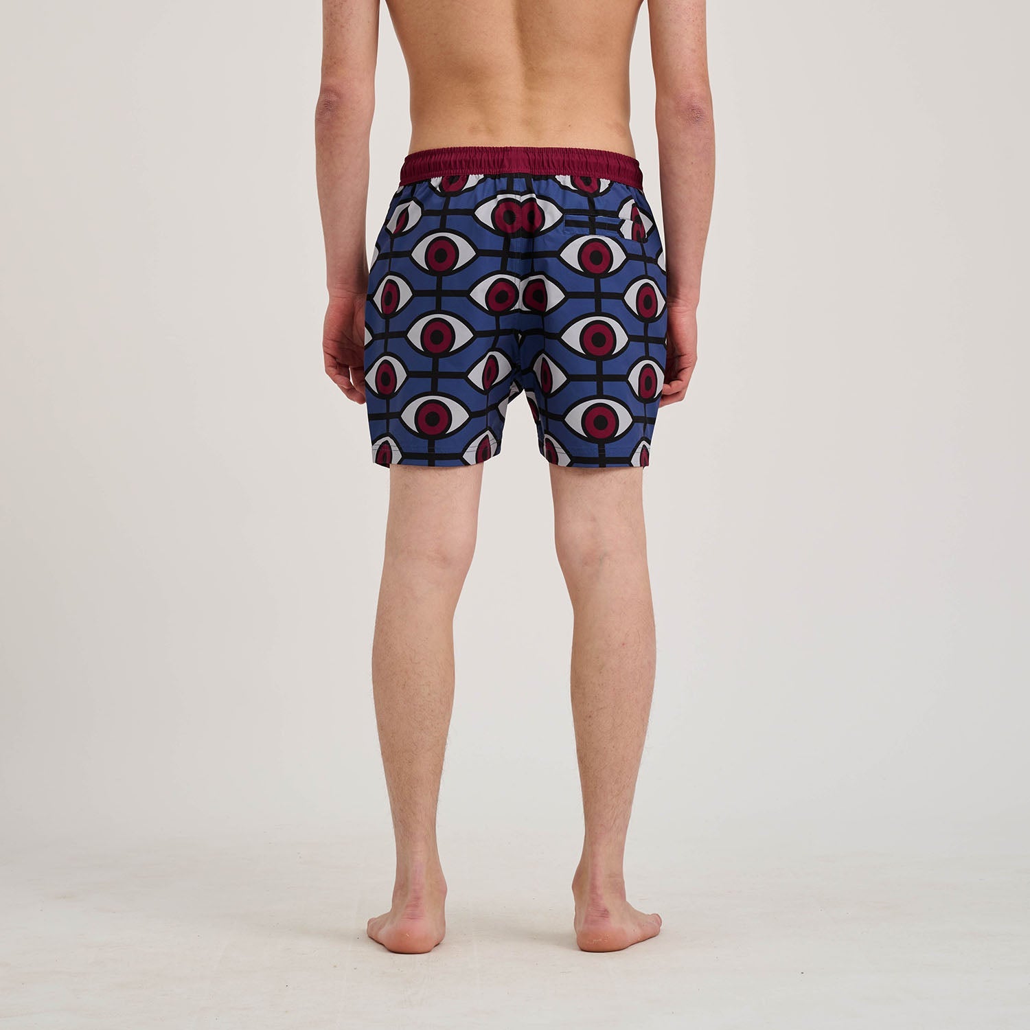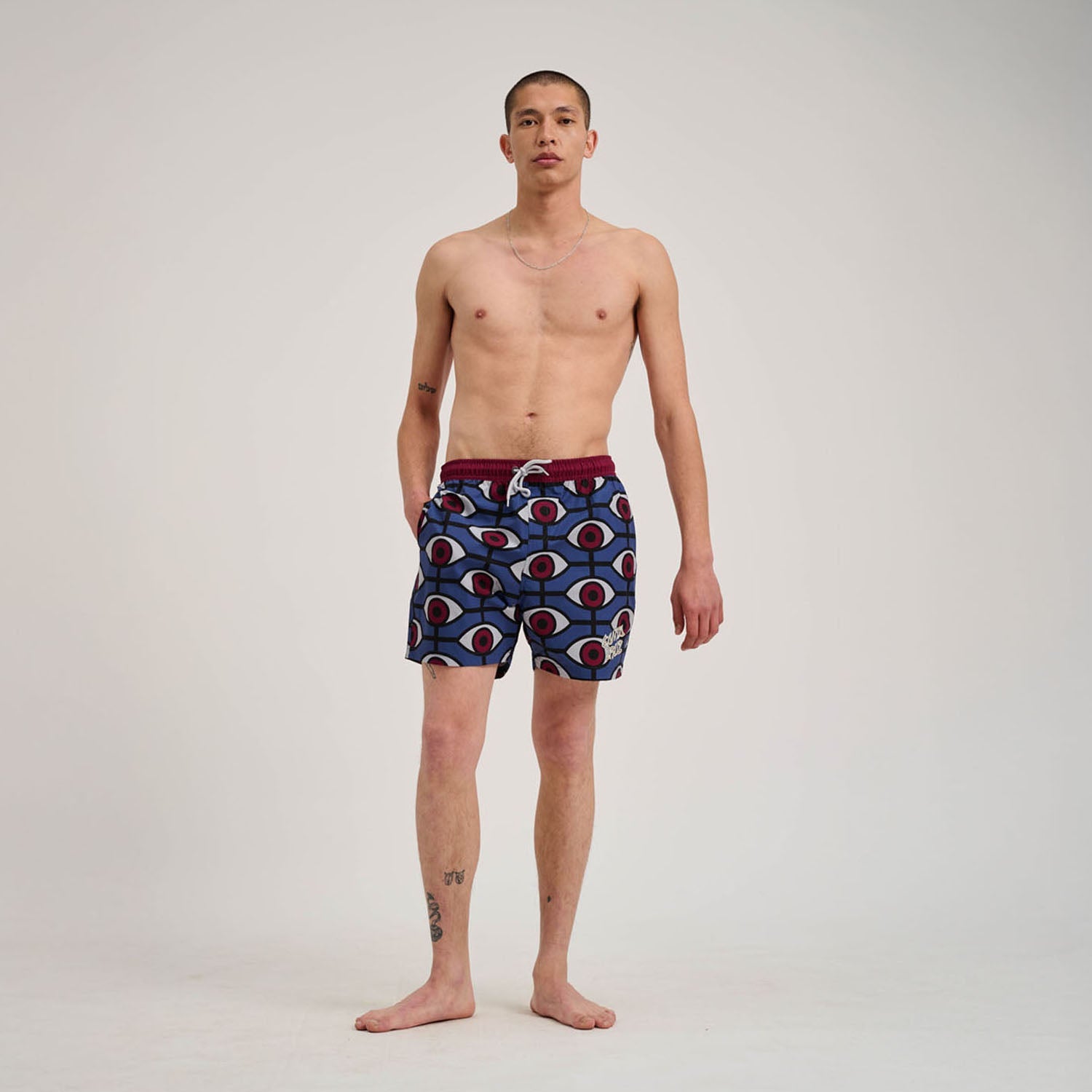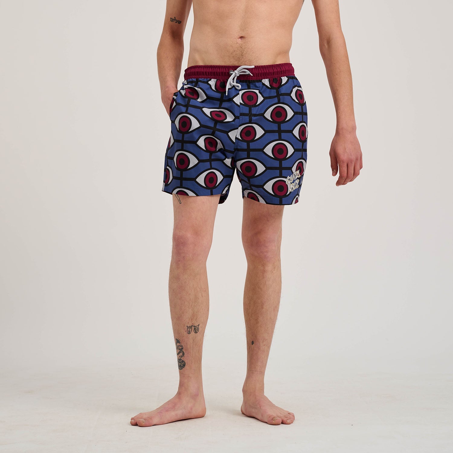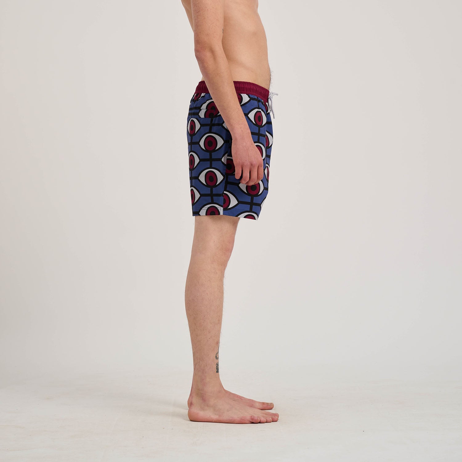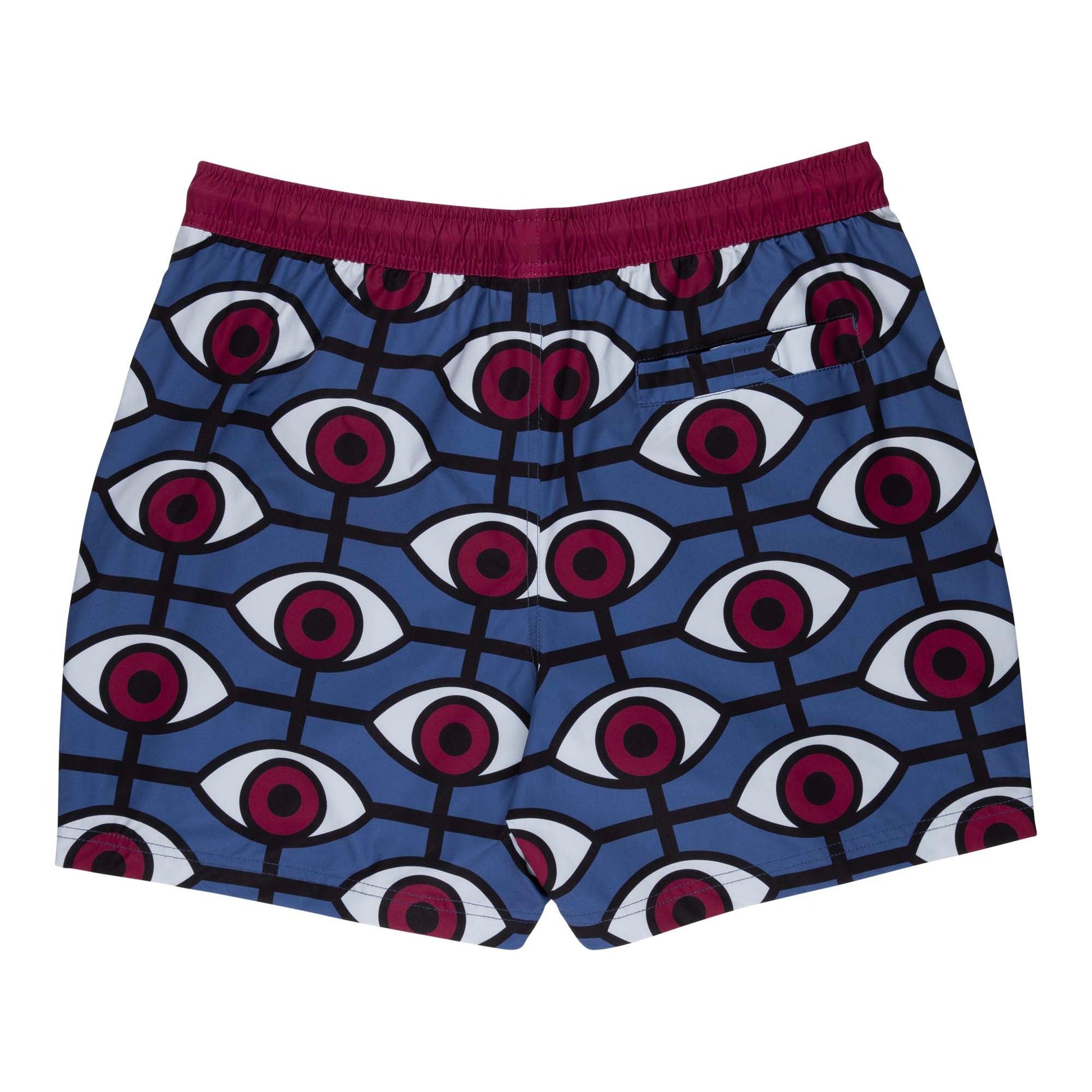 100% polyester, stretch microfibre, elasticated waist swimshort with 17" outseam, side pockets, back pocket, all over sublimated print and print at hem