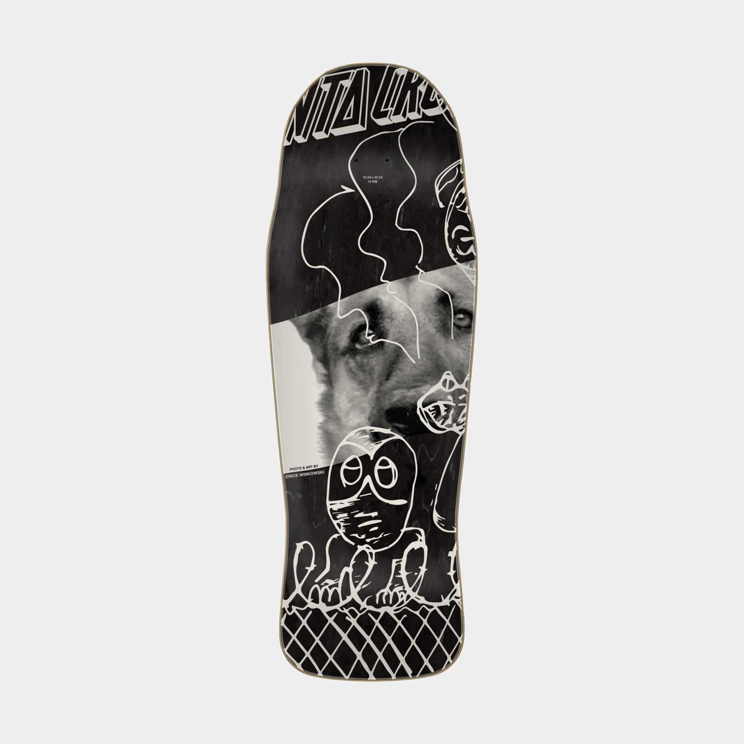 The Santa Cruz Skateboards Winkowski Tribute Pro Shaped deck is a tribute to Erick's friend Georgia. Digitally printed in color on bottom and black and white on deck top. On Erick's custom shape with a 15" wheelbase. Photo and artwork by Erick Winkowski.