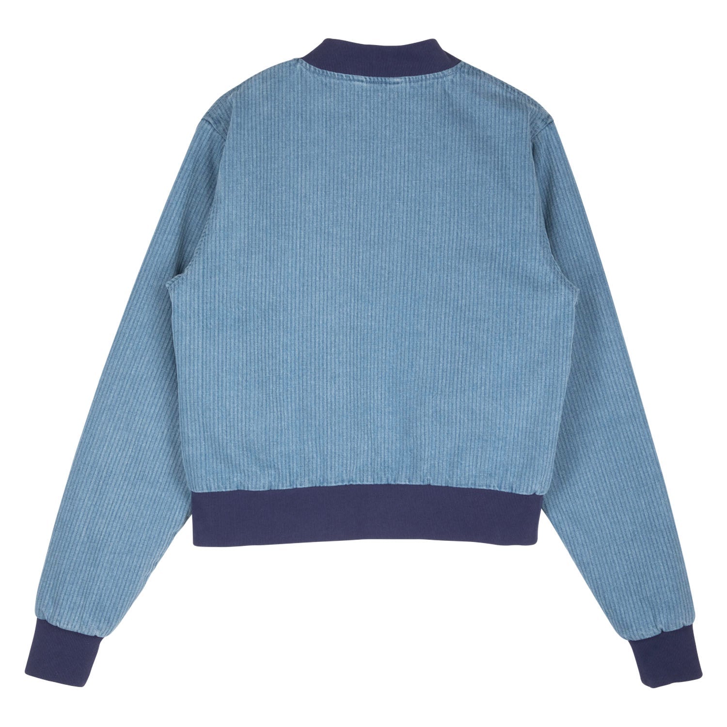 95% cotton, 5% polyester, 12oz denim, loose fit, bomber jacket with front pockets, quilted lining, and woven label branding