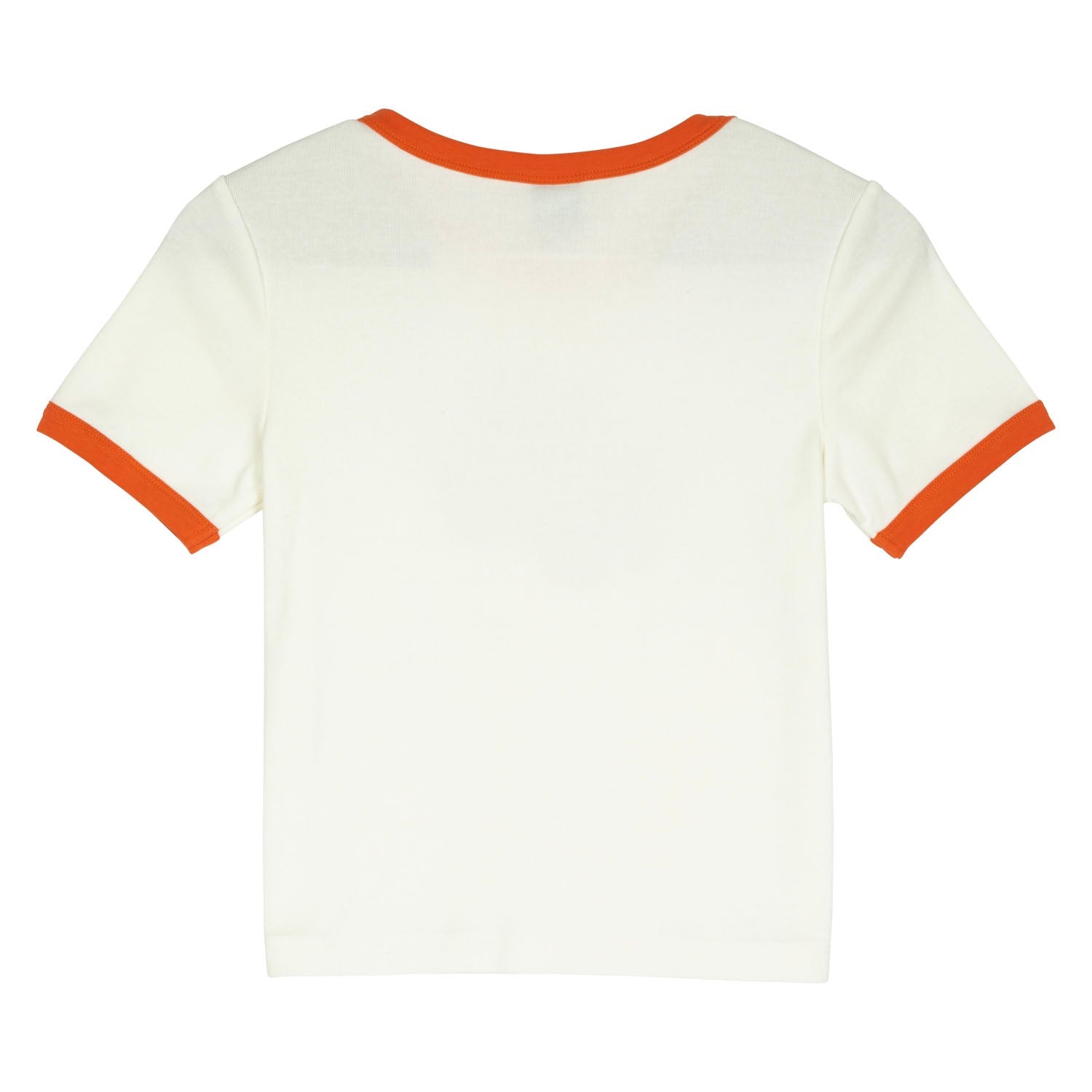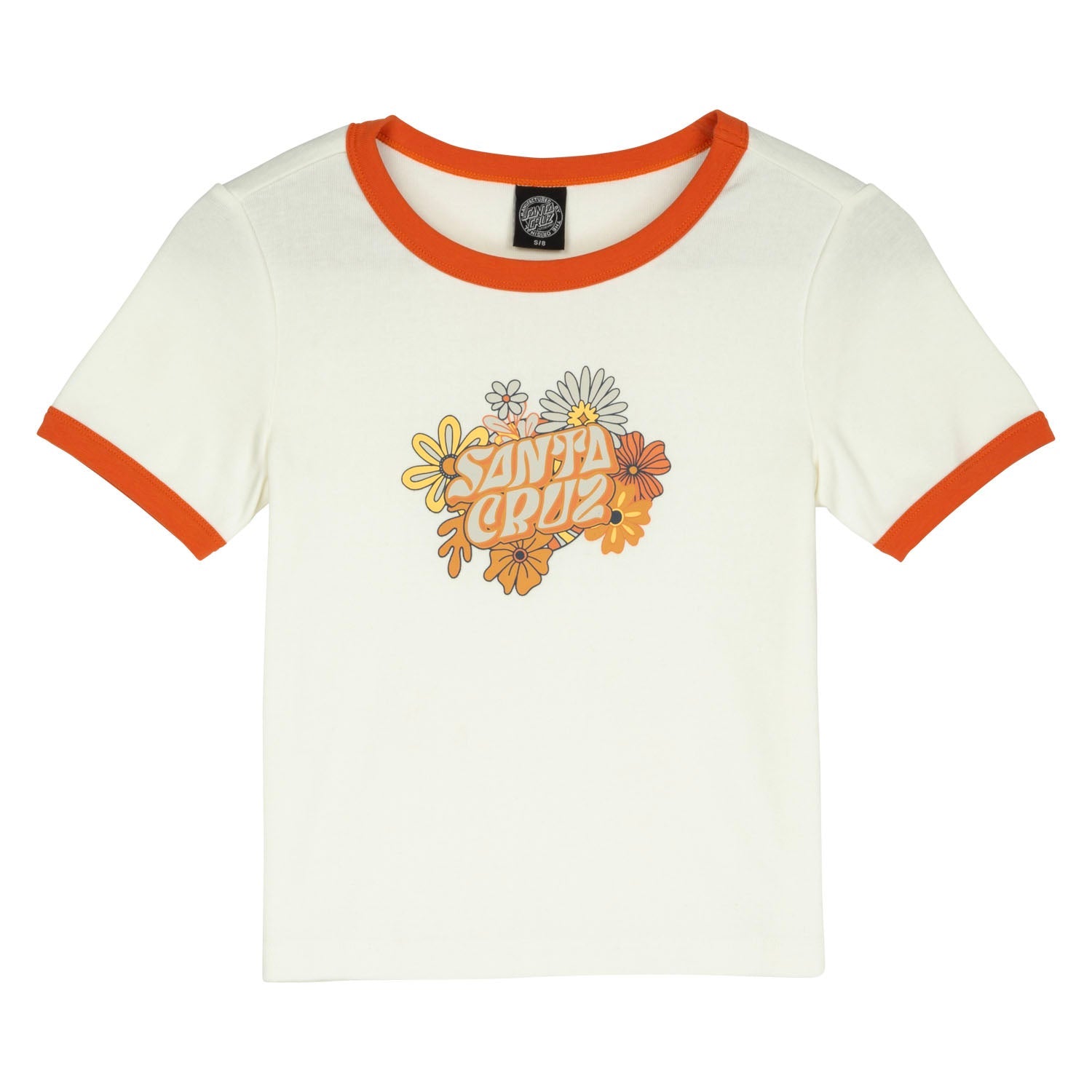 70% cotton, 30% polyester, 210gsm rib jersey, cropped fit, short sleeve, ringer t-shirt with contrast neck and sleeve rib and front print