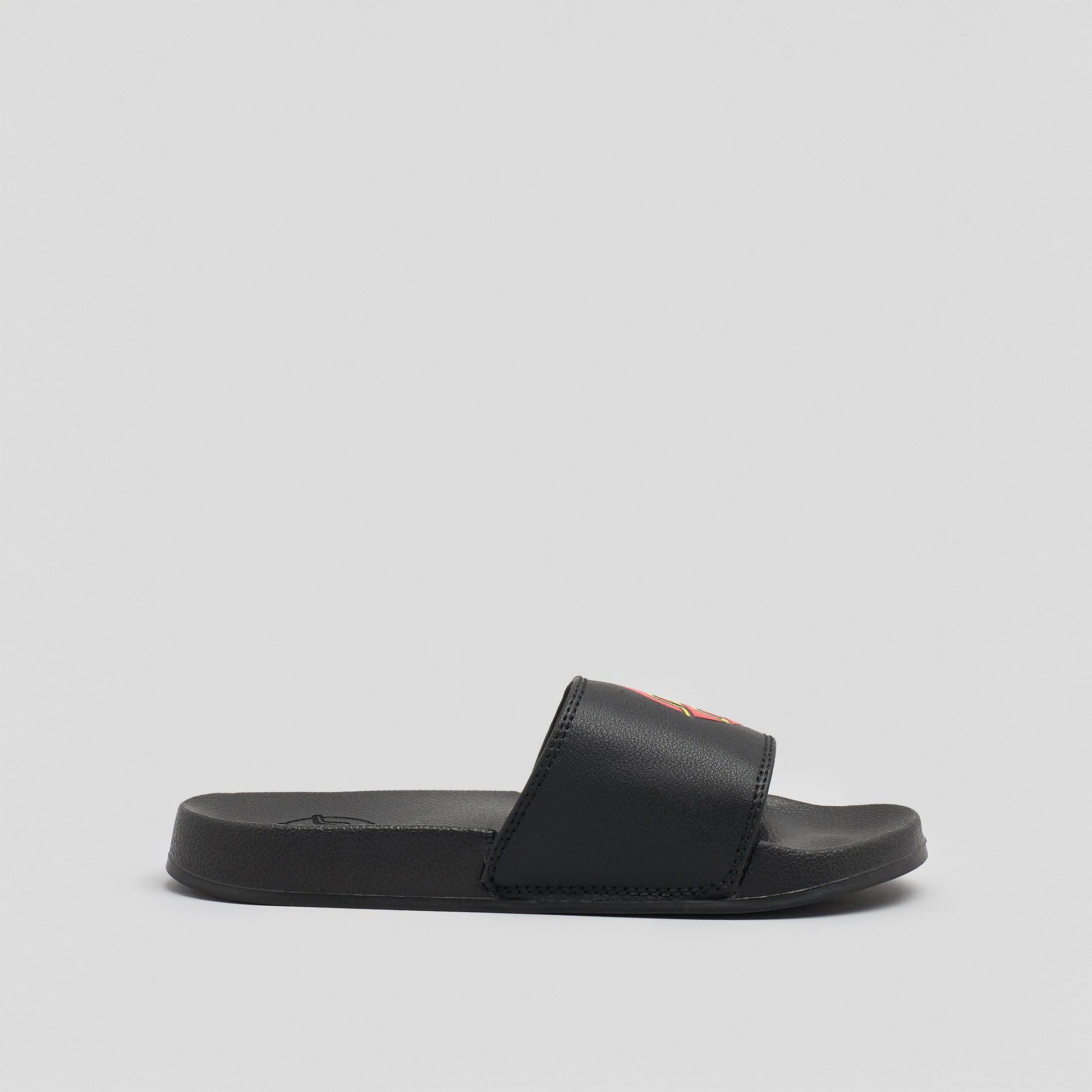 Upper: PU, lining: 100% polyester, sole: EVA, slide on sandals with screen print logo on upper and embossed logo on footbed