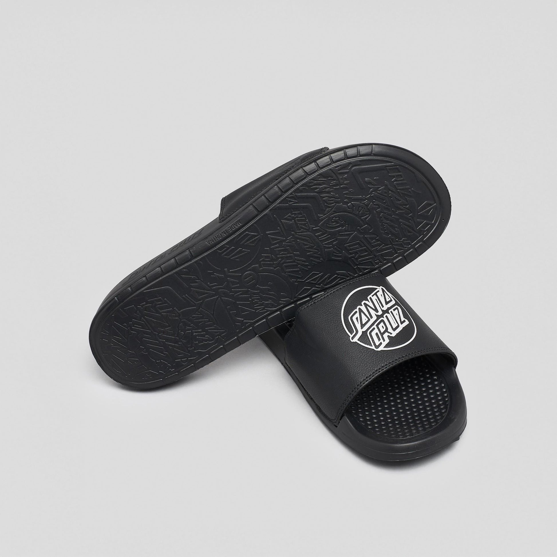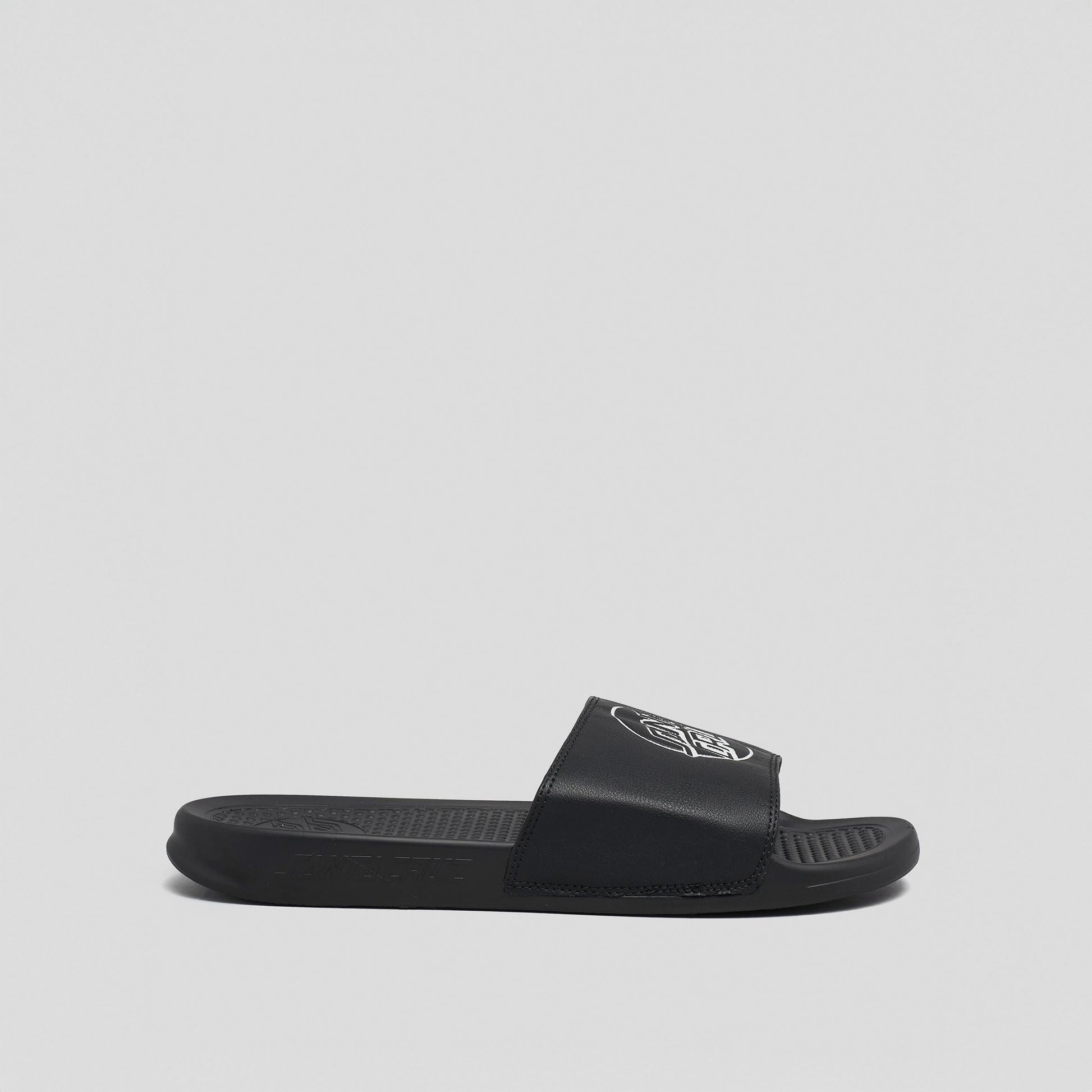 Upper: PU, lining: 100% polyester, sole: PU, slide on sandals with screen print logo on upper, embossed logo on footbed and repeat logo embossed grip on sole