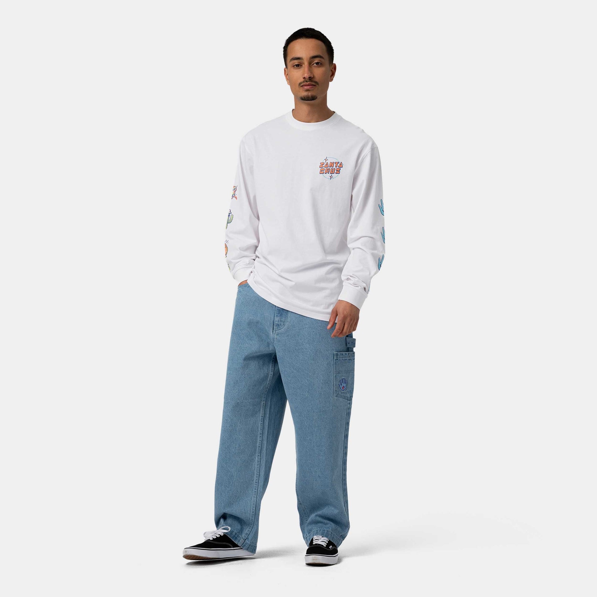 94% cotton, 6% polyester, 13.5oz denim, baggy fit pant with front pockets, back pockets, side leg pocket, hammer loop and embroideries at front left leg pocket, right leg side seam and back right pocket Size 34, Inseam - 30" / Leg opening - 9 1/8"