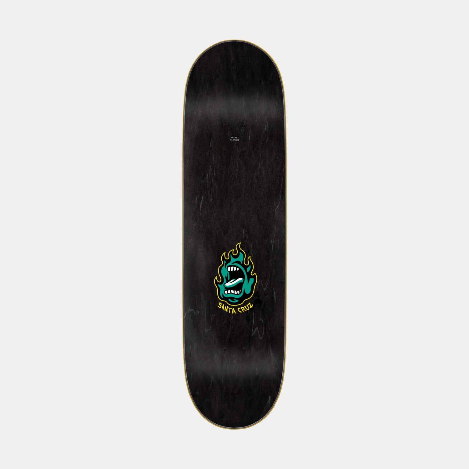 The Santa Cruz Skateboards Screaming Flame Birch 7 Ply deck features Santa Cruz Screaming Flame artwork on a stained teal bottom ply with small Screaming Flame graphic on stained black top ply.