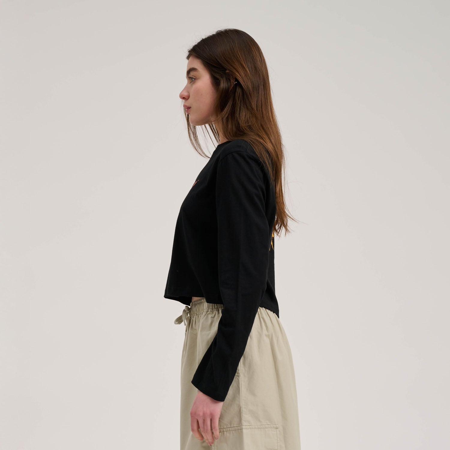 100% cotton, 160gsm jersey, boxy cropped fit, long sleeve t-shirt with chest print and back print