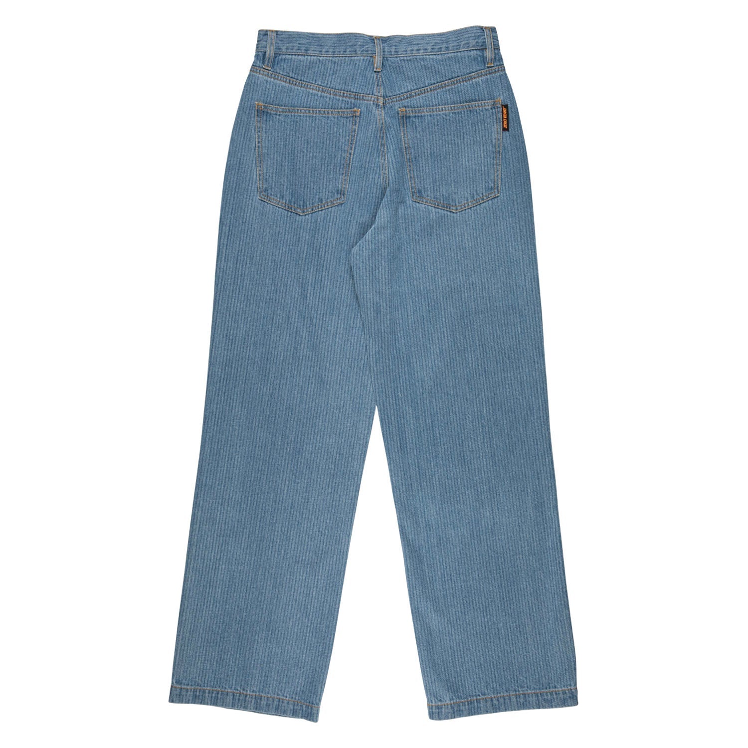 BLUE STRIPE: 95% cotton, 5% polyester, 12oz denim, wide leg jeans with front pockets, back pockets and woven label branding