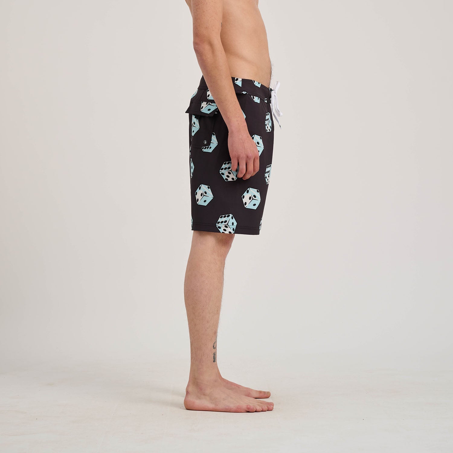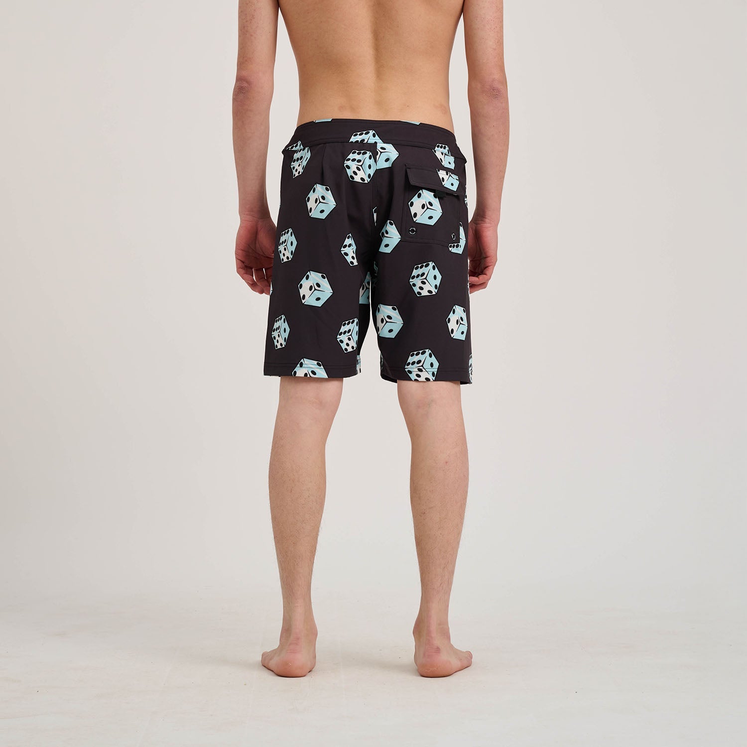 92% RPET, 8% elastane, 4 way stretch, boardshort with 19" outseam, drawstring closure at waist, back pocket, all over sublimated print and embroidery at hem