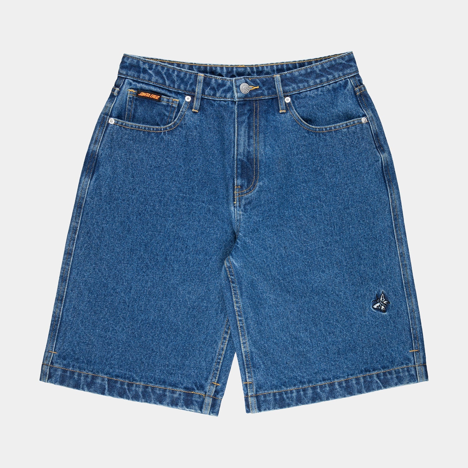 94% cotton, 6% polyester, 13.5oz denim, baggy fit shorts with front pockets, back pockets, front embroidery, back pocket embroidery and woven label branding