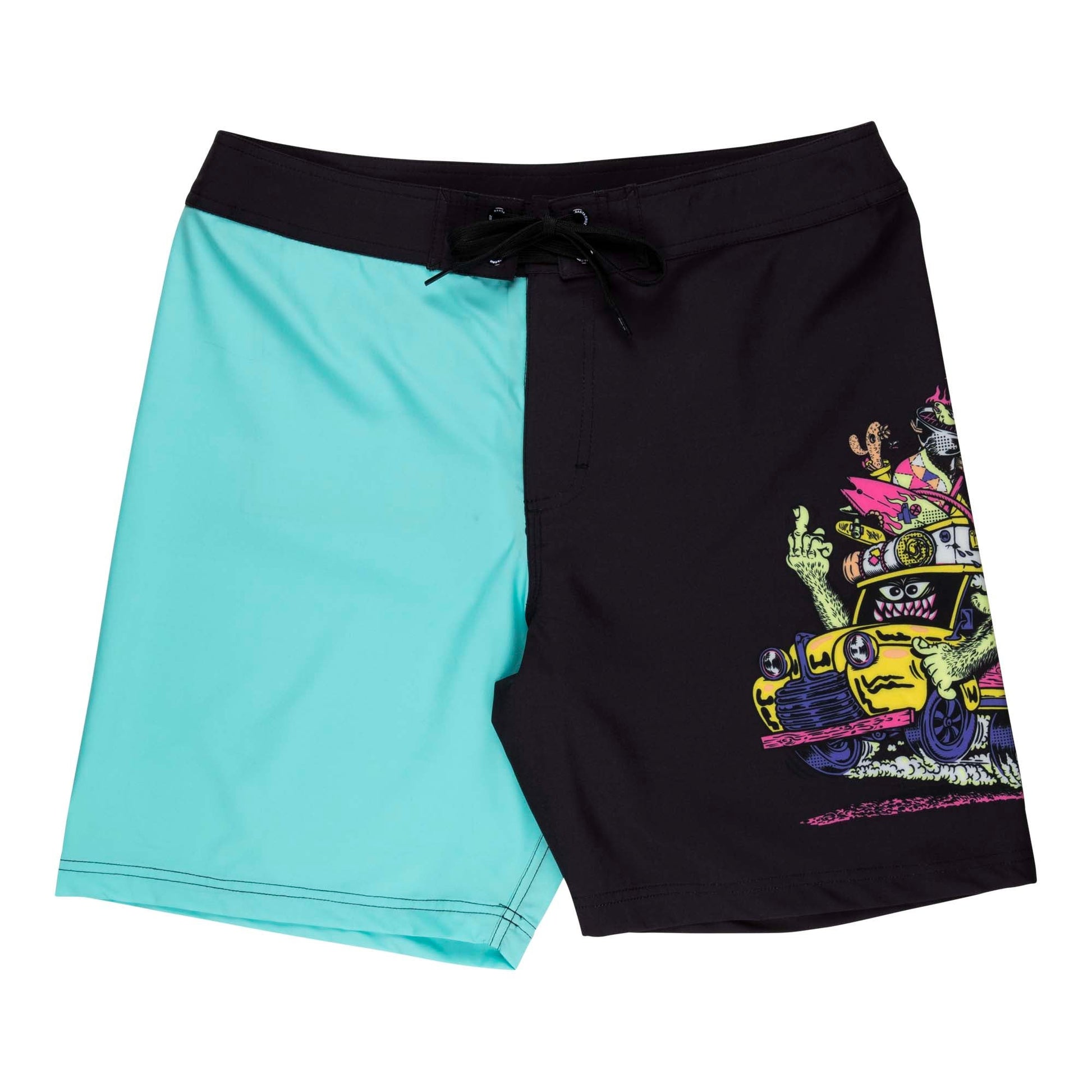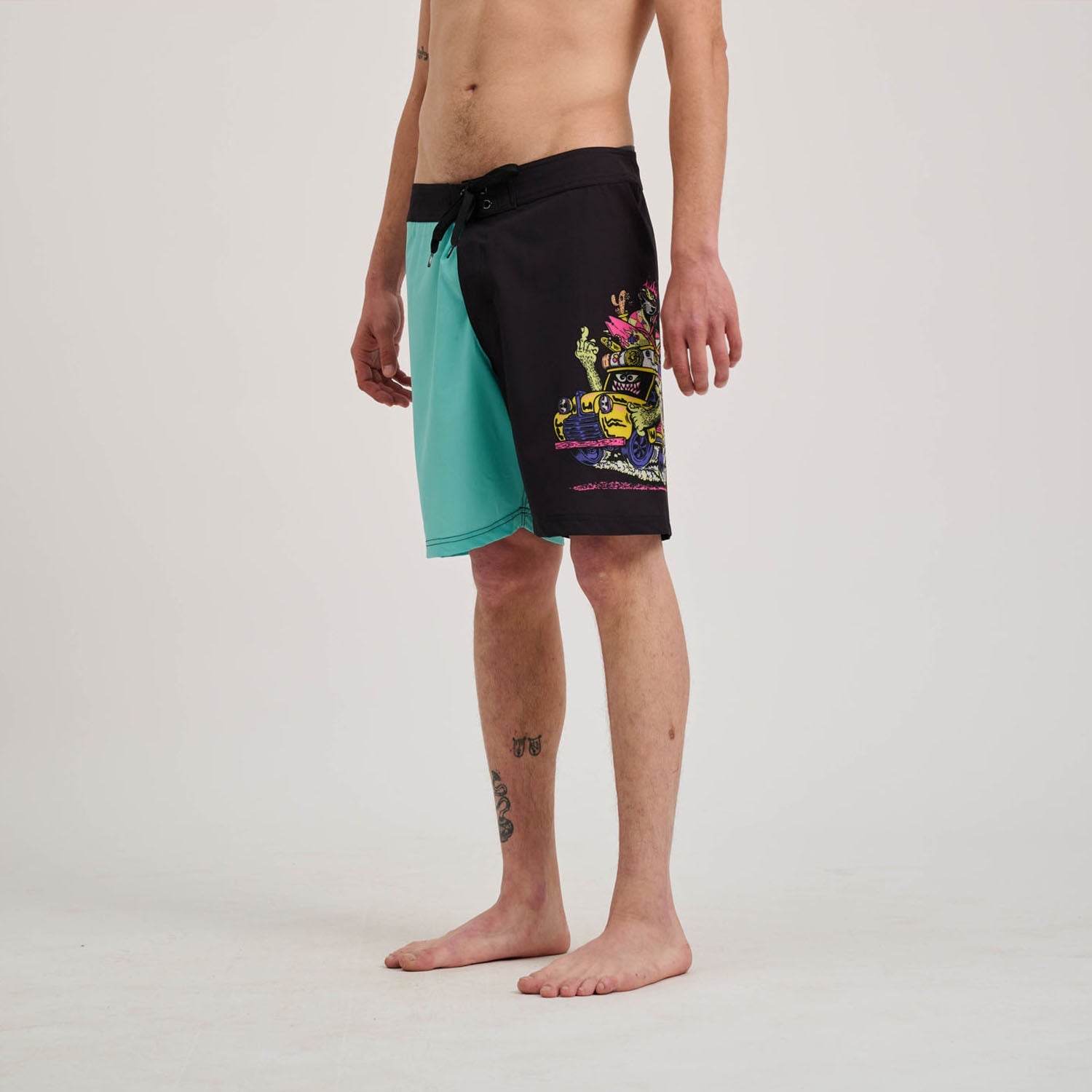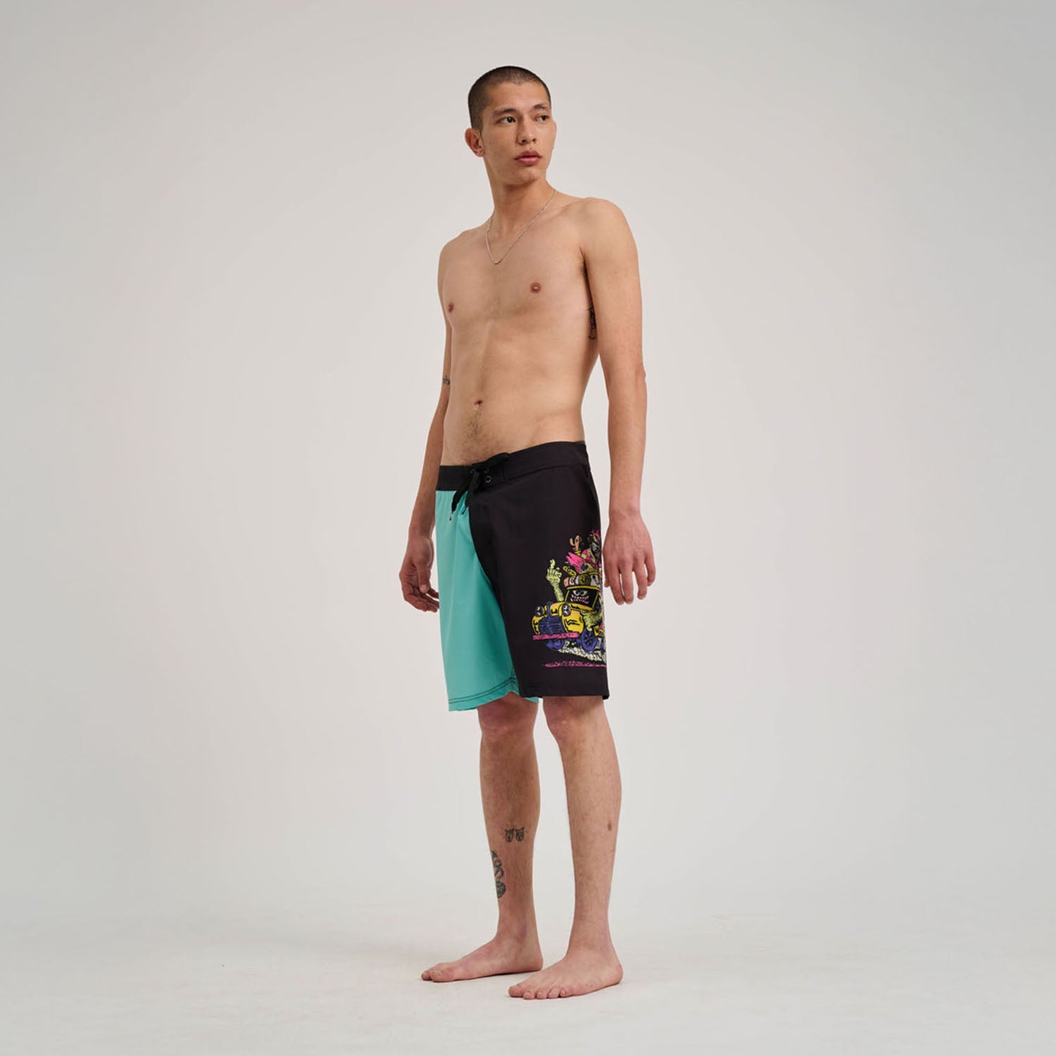92% RPET, 8% elastane, 4 way stretch, boardshort with 19" outseam, drawstring closure at waist, back pocket, sublimated leg print and back pocket print