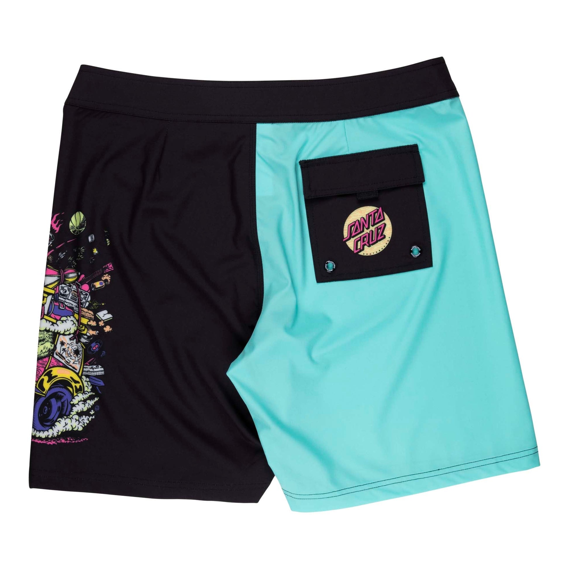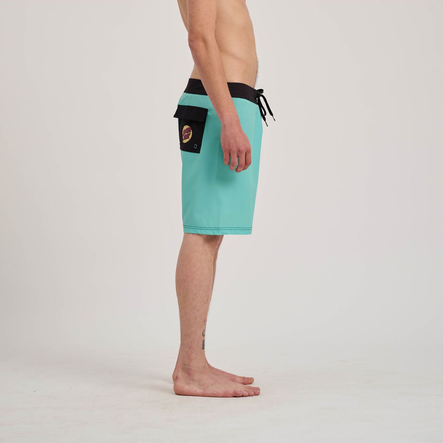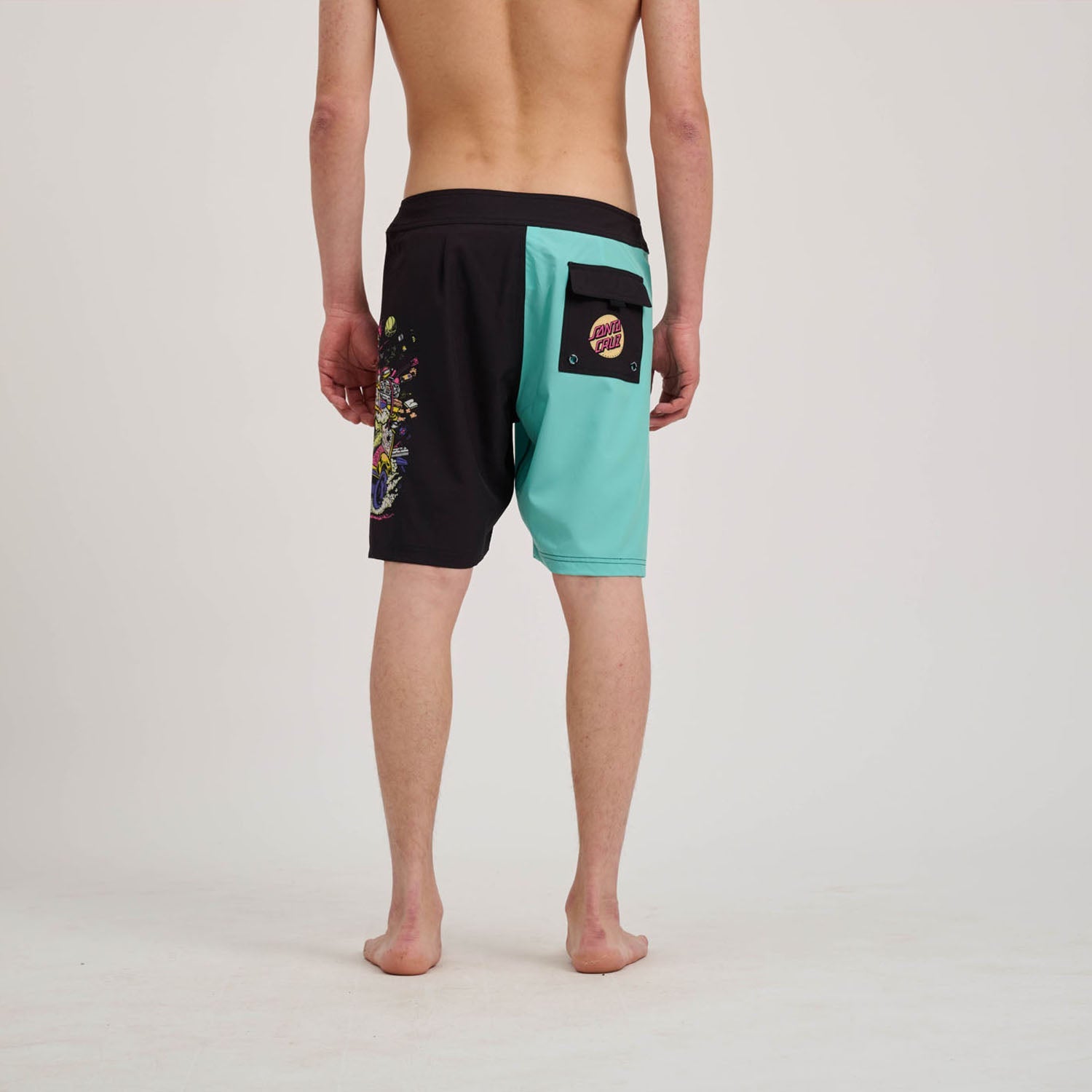 92% RPET, 8% elastane, 4 way stretch, boardshort with 19" outseam, drawstring closure at waist, back pocket, sublimated leg print and back pocket print