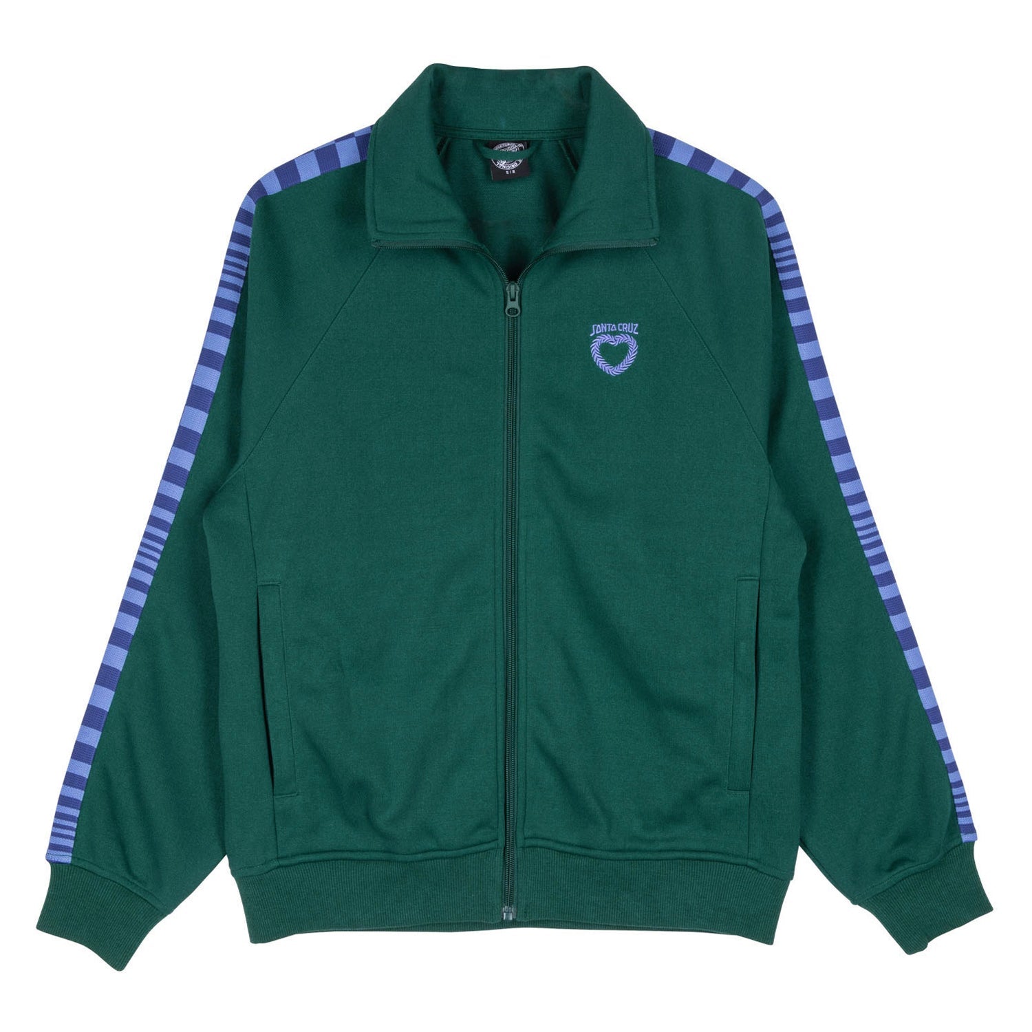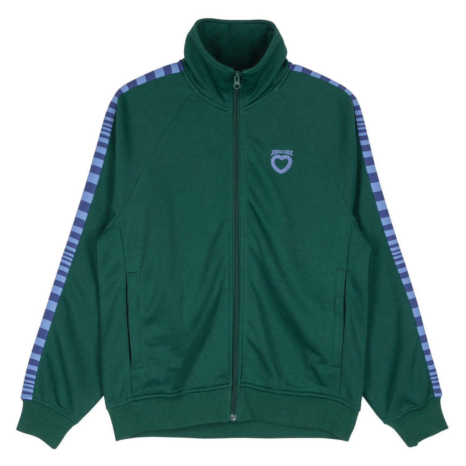 100% polyester tricot, regular fit, funnel neck, full zip jacket with front zip pockets, custom jacquard tape at sleeves and left chest embroidery