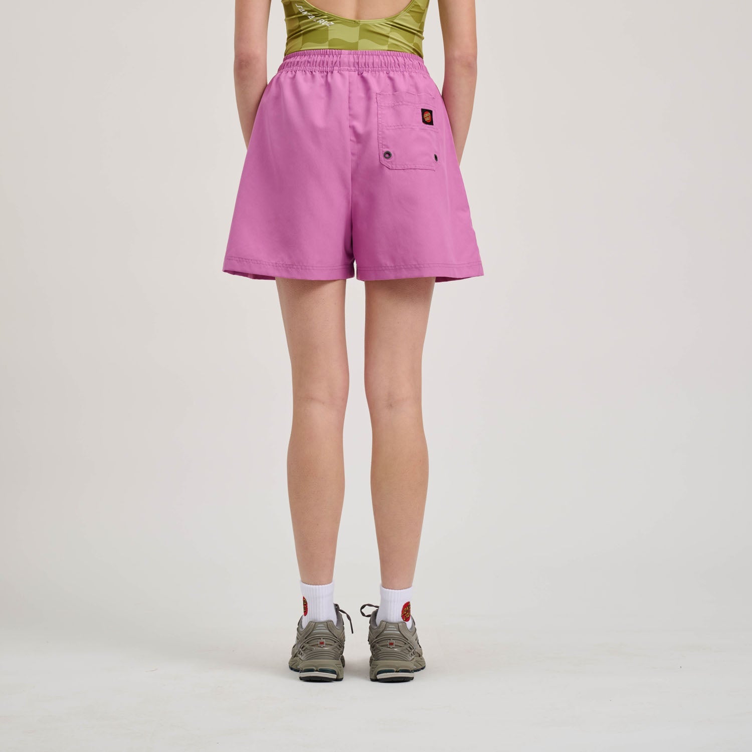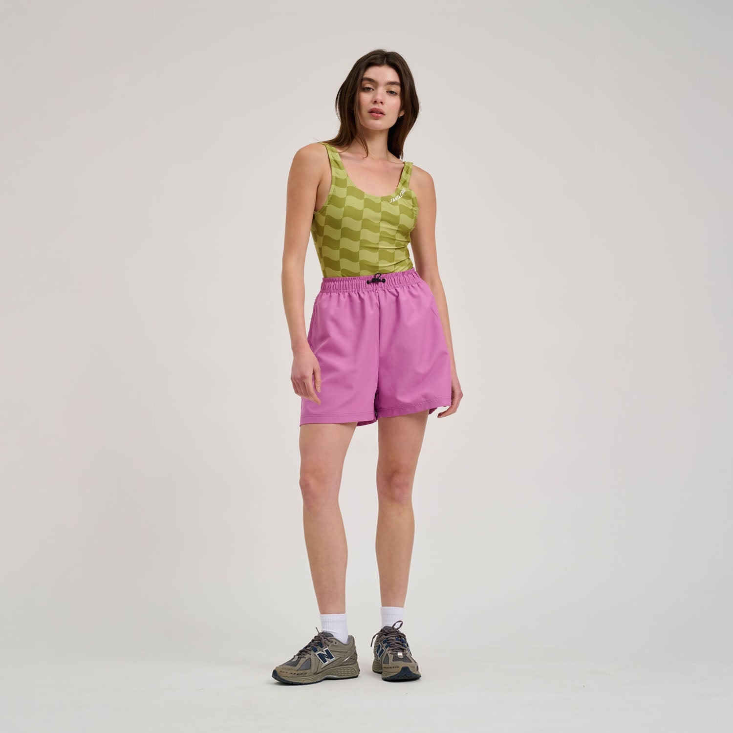 100% polyester, peach microfibre, elasticated waist swimshort with side pockets, back pocket, Chartreuse Wave Check: all over sublimated print and woven label branding