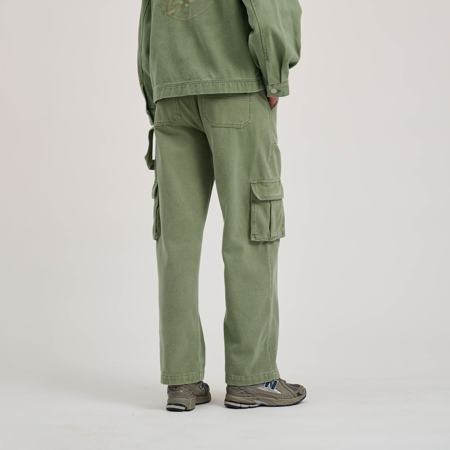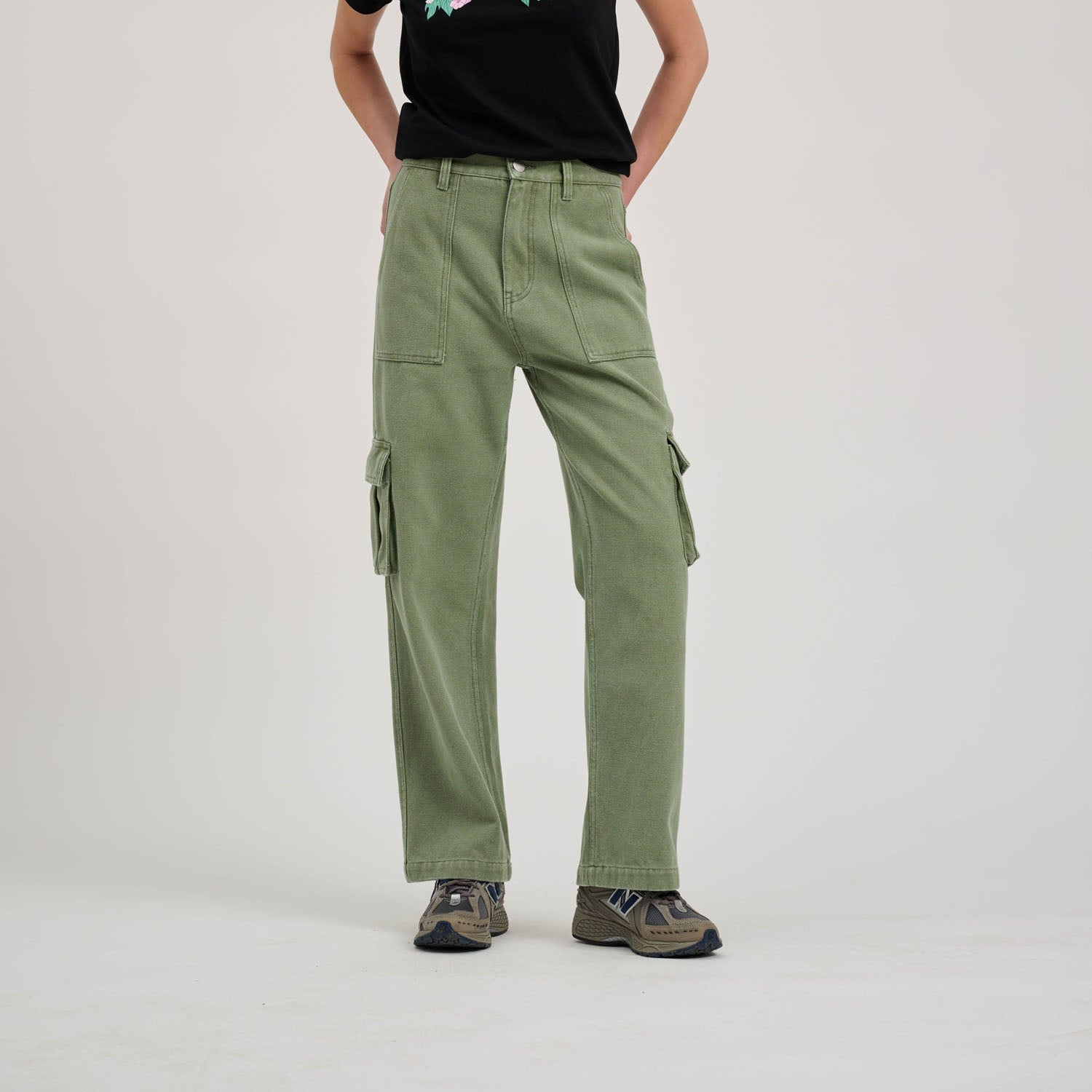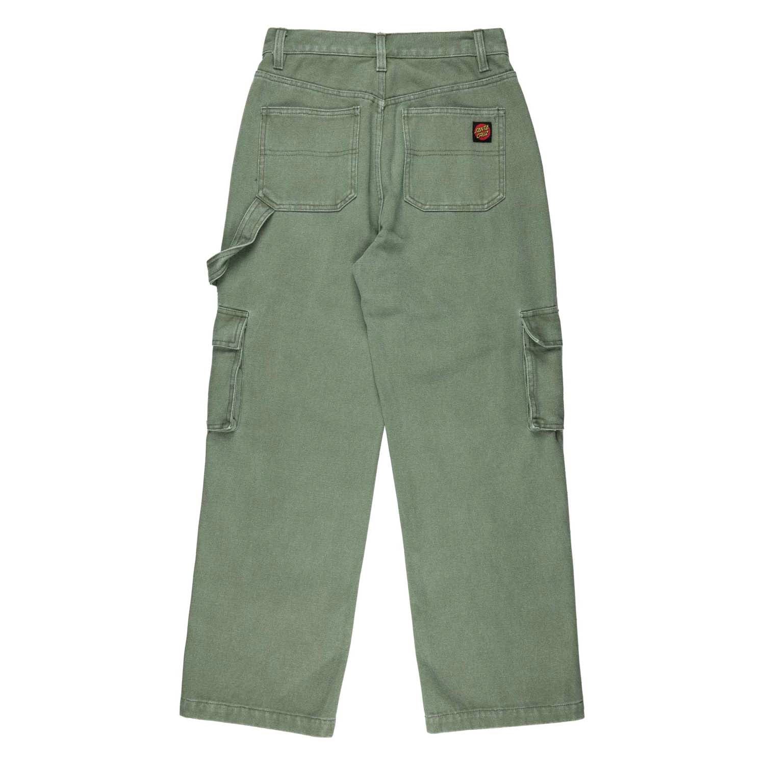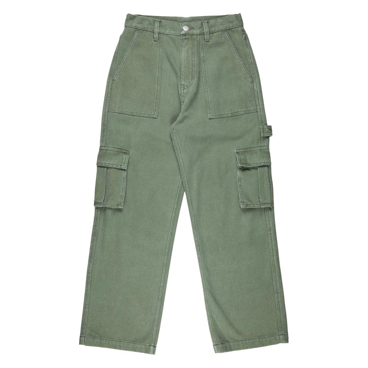 100% cotton canvas, enzyme washed, wide leg pant with front pockets, back pockets, cargo pockets, hammer loop and rear pockets with woven label branding