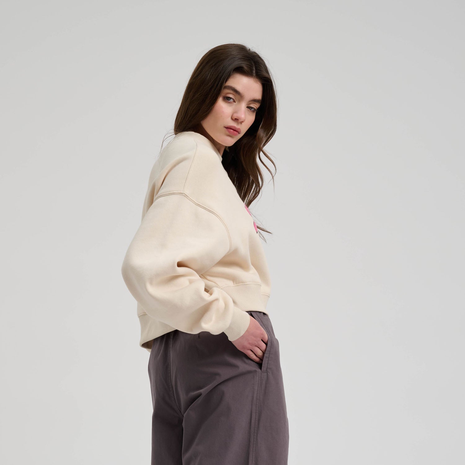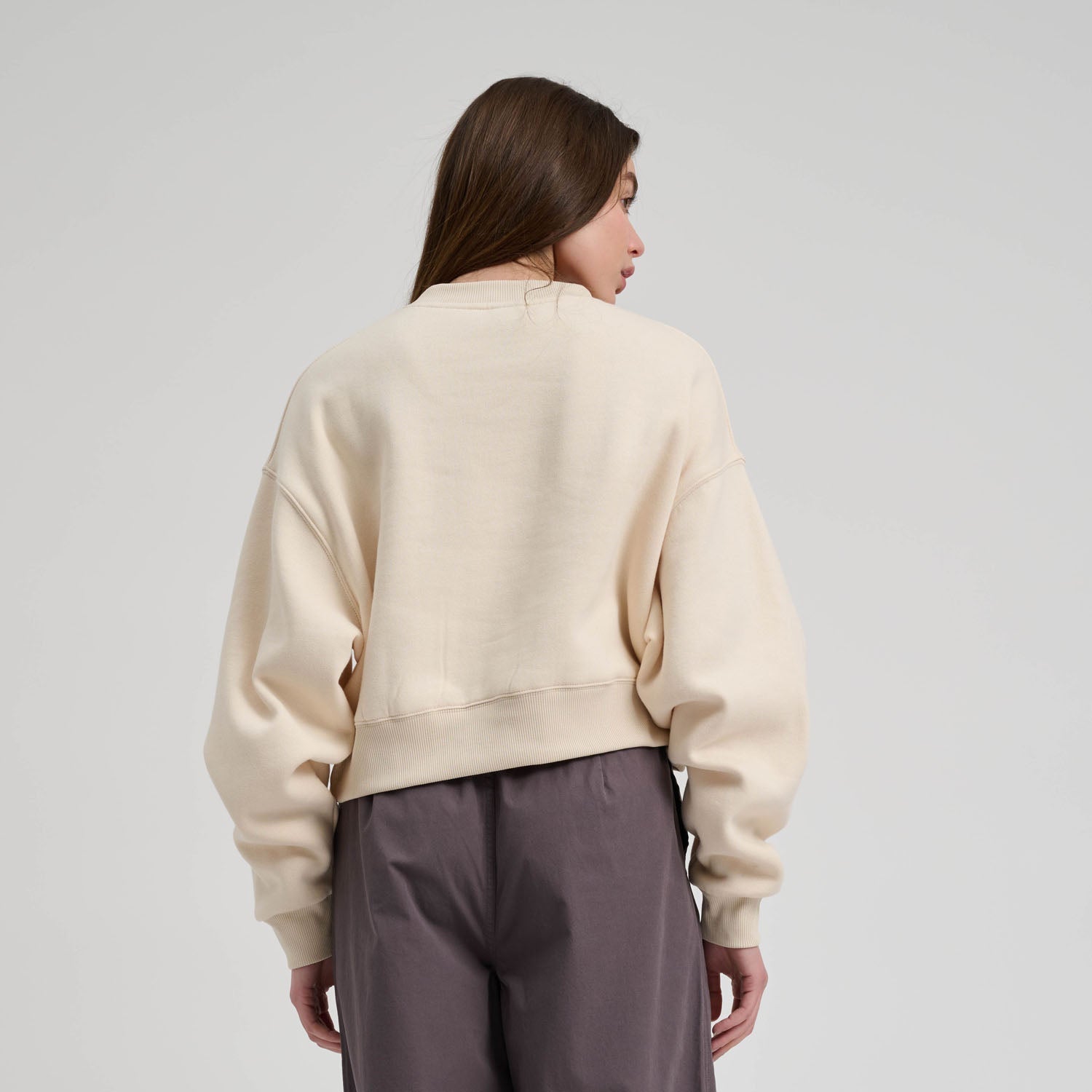 80% cotton, 20% polyester, 330gsm brushed fleece, oversized cropped fit, crew sweatshirt with chest chenille applique
