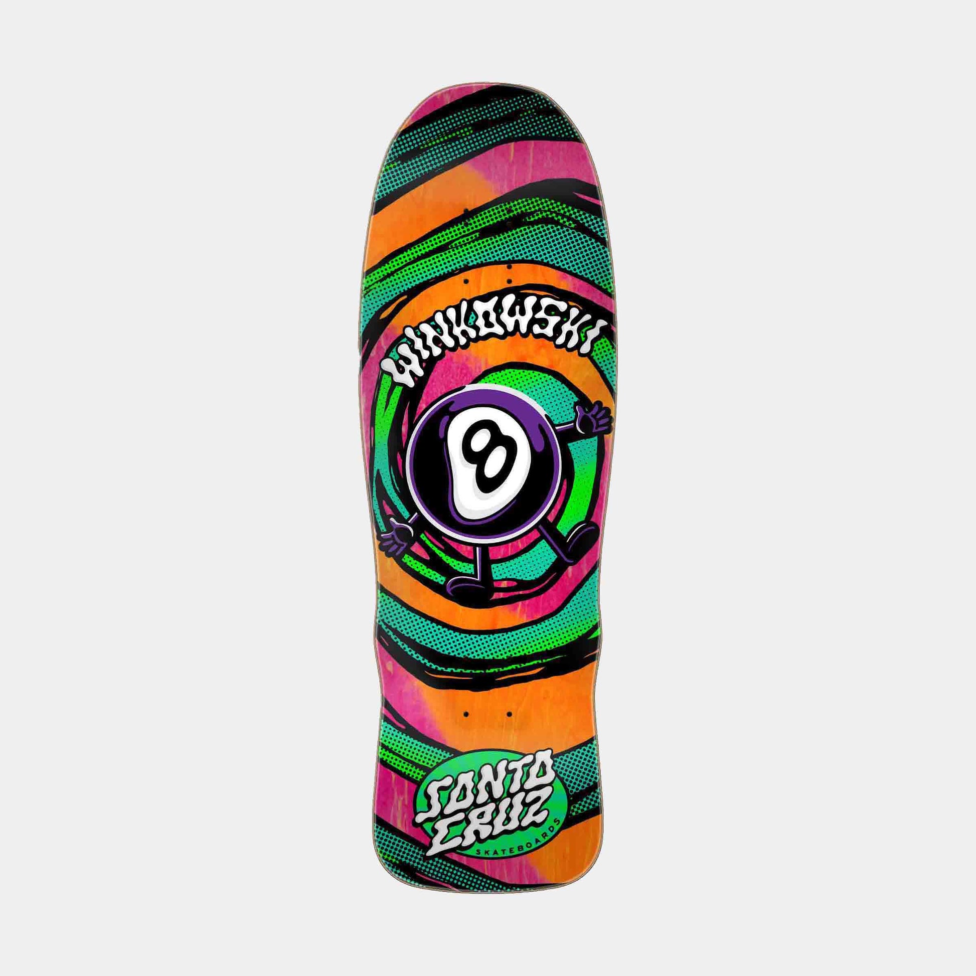 Santa Cruz Skateboards Erick Winkowski Vertigo MED Pro Shaped deck featuring a new medium version of Erick's newest shape for smaller skaters with adjustable 14-14.5" wheelbase, spot gloss and neon graphics with hand stained veneer and half tone fades.