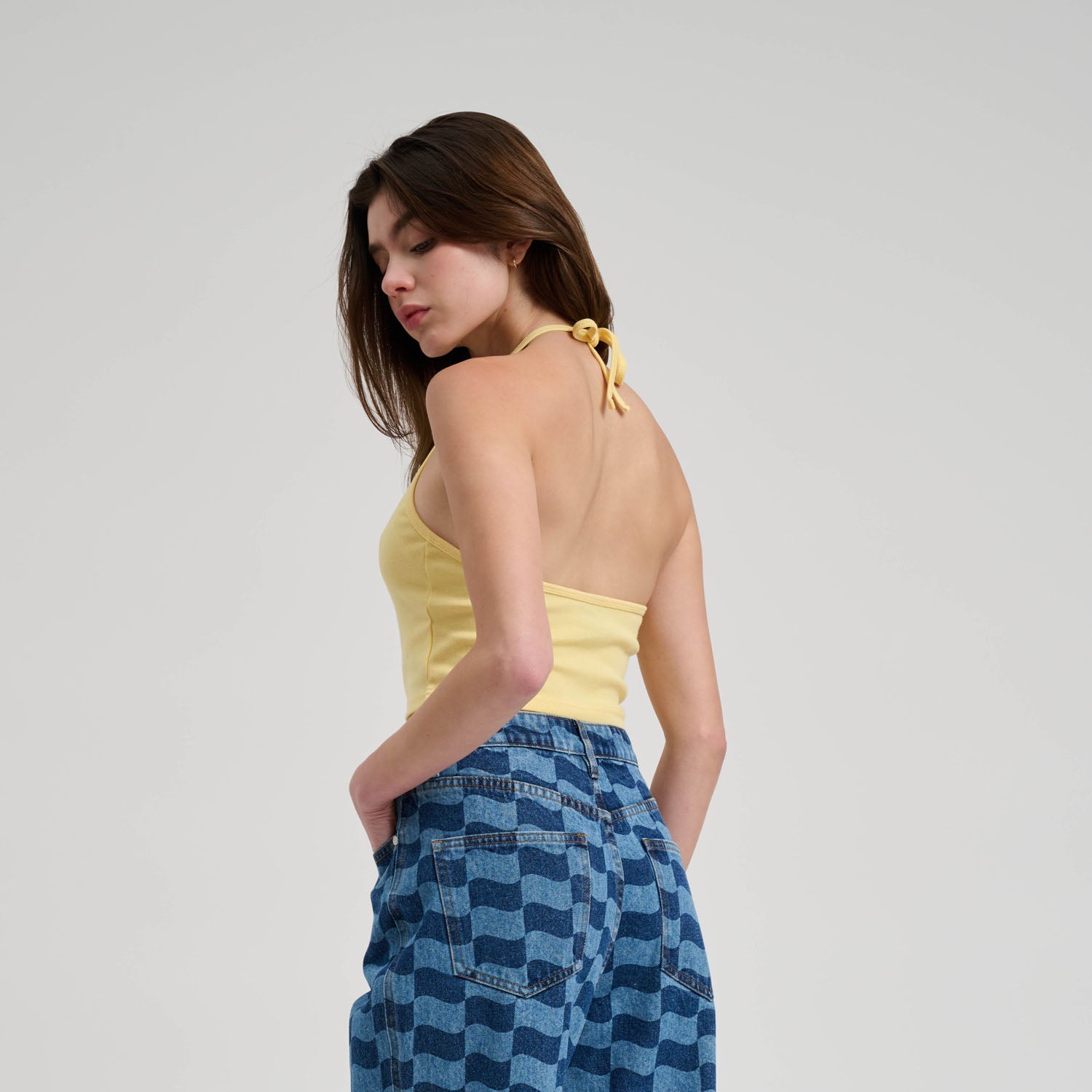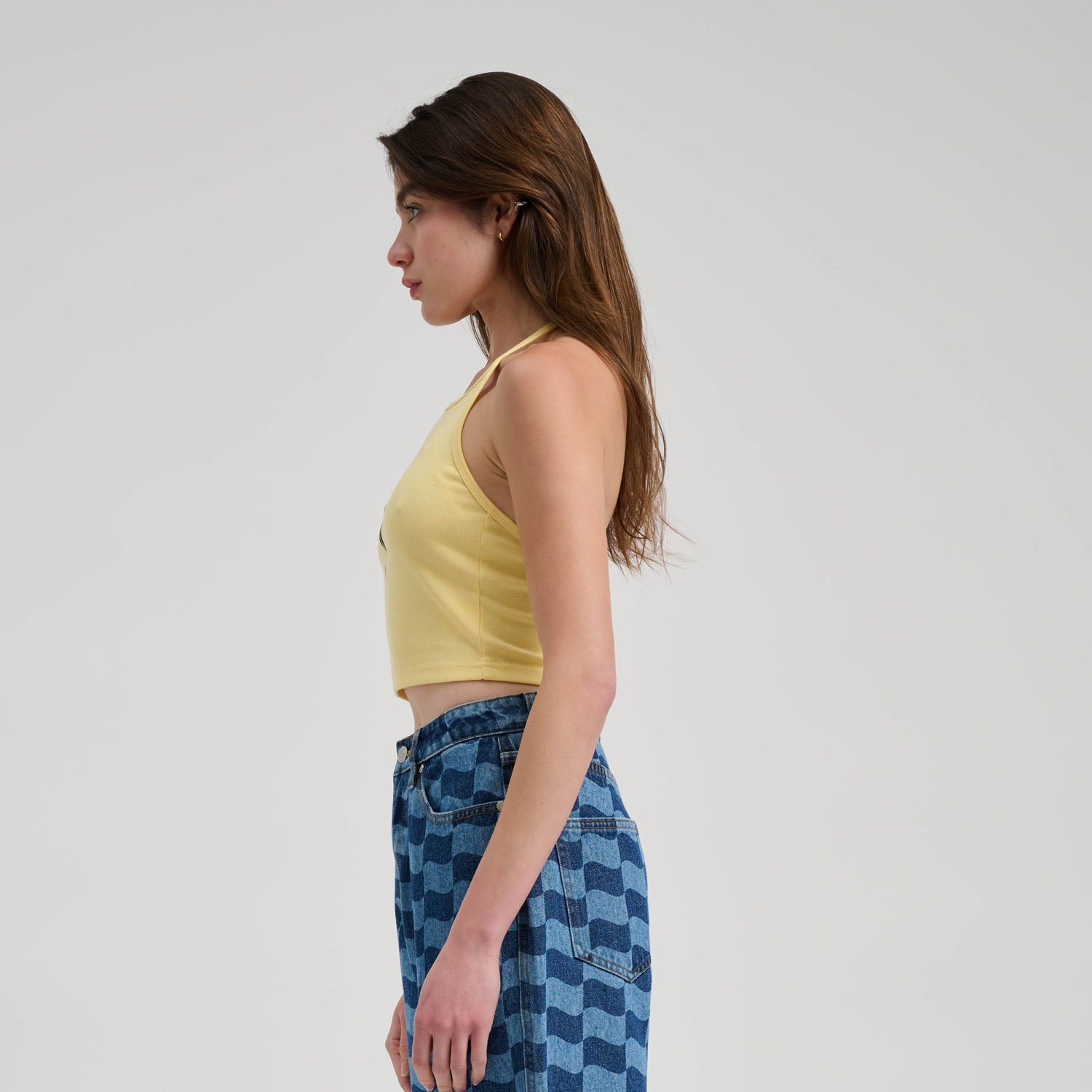 70% cotton, 30% polyester, 210gsm 1x1 rib jersey, cropped fit, halter neck top with chest print