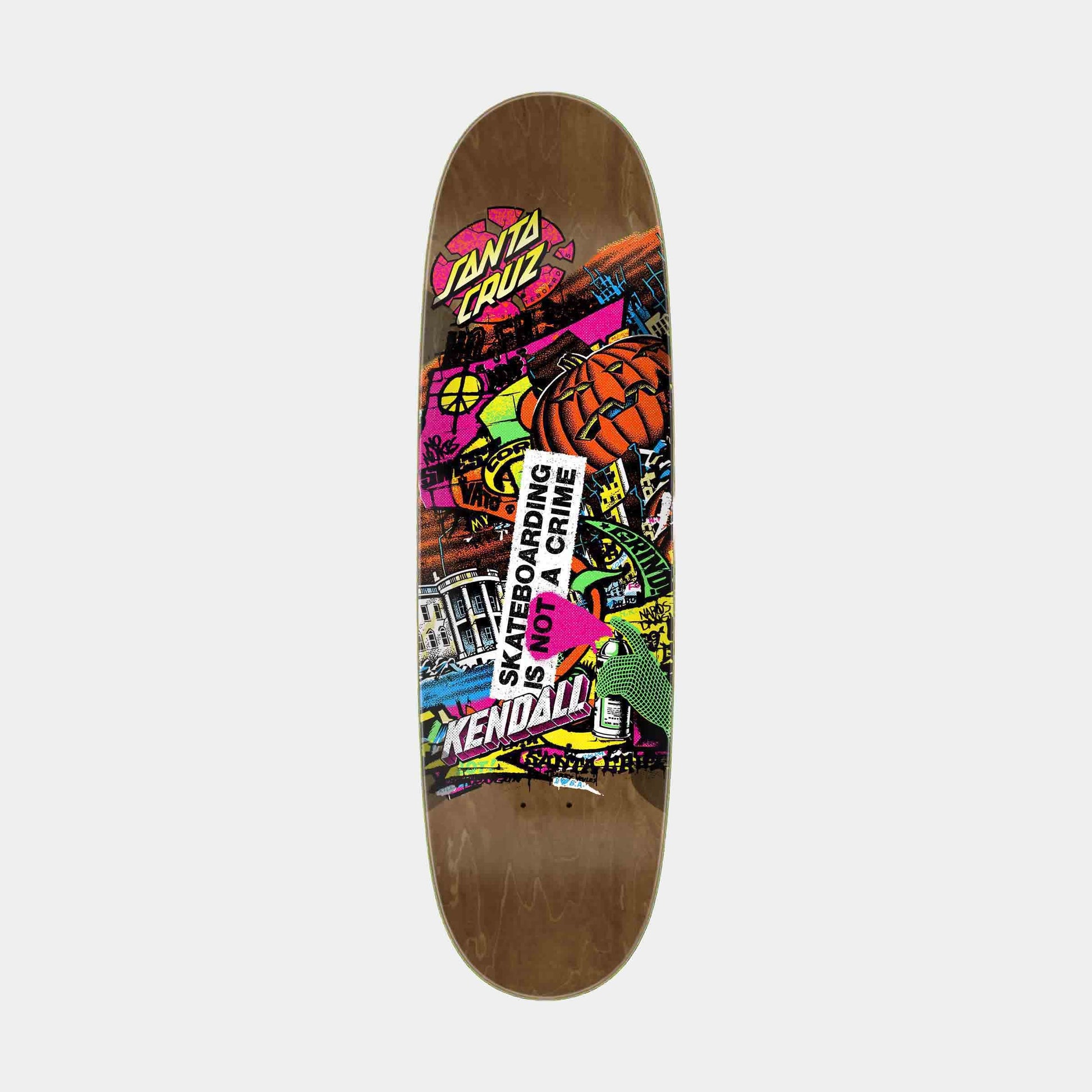 Santa Cruz Skateboards Jeff Kendall Street Art Collage VX Deck featuring spot matte and neon graphics on brown stained veneer with custom 9" egg shape with 4 wheel wells.