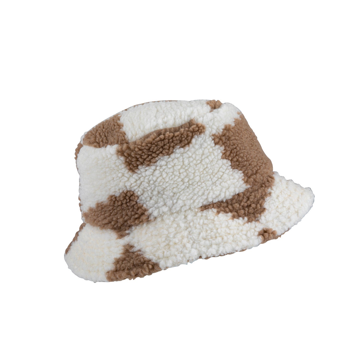 100% polyester, sherpa fleece, bucket hat with all over pattern and woven label