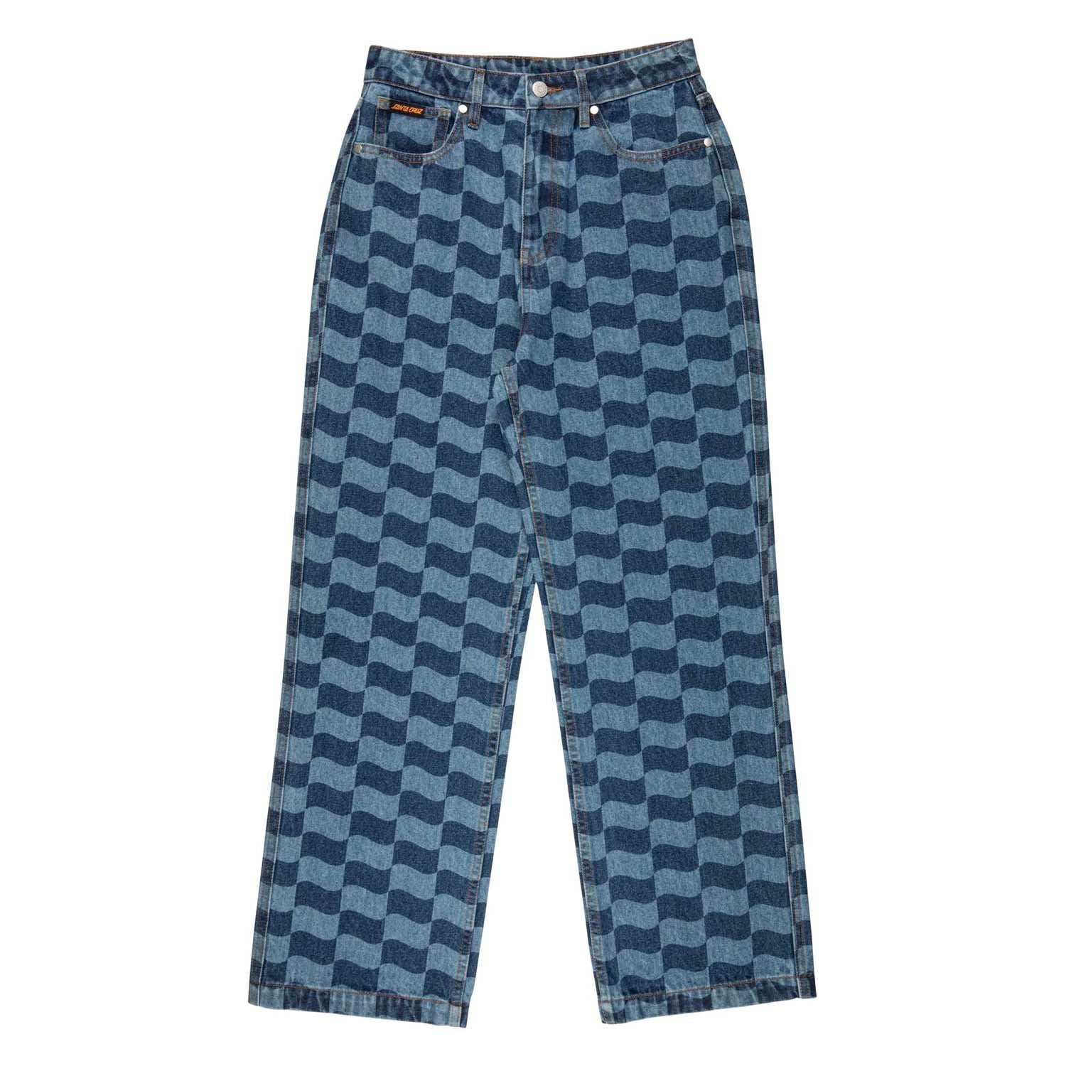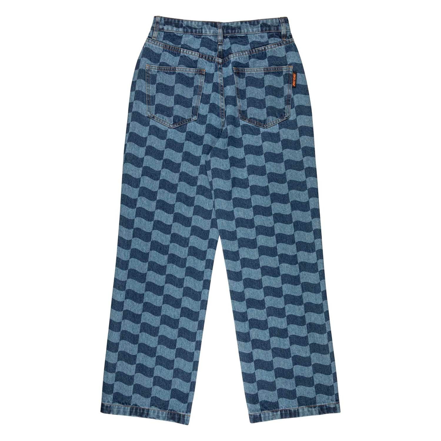 94% cotton, 6% polyester, 13.5oz denim, wide leg jeans with front pockets, back pockets, Blue Wave Check: all over discharge print and woven label branding