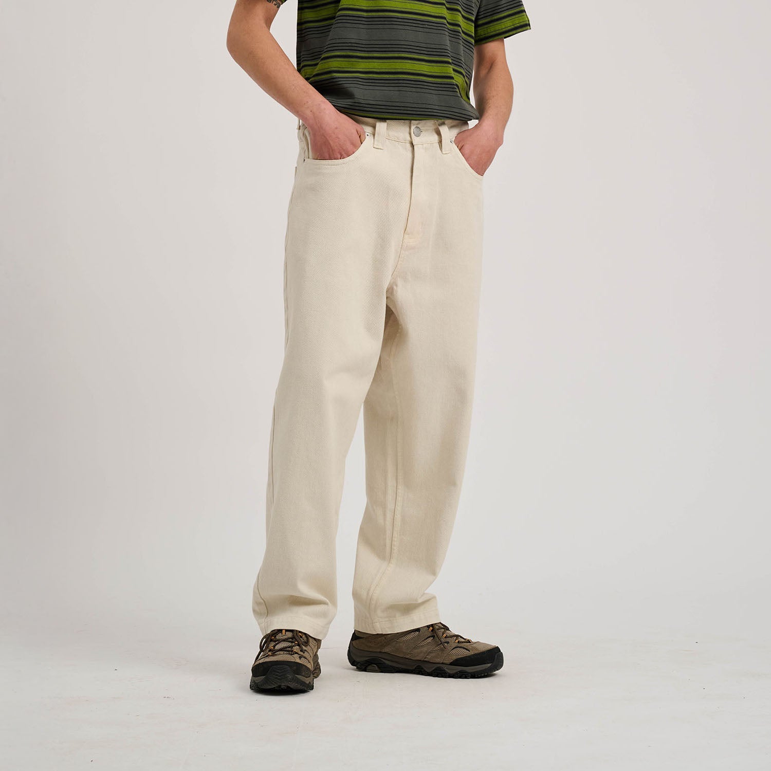 Iguana/Blond Wood/Washed Black: 100% cotton twill, garment dyed, Big Dice/Stone Wash/Classic Blue: 94% cotton, 6% polyester, 13.5oz denim, Big Dice: all over discharge print, baggy fit pant with front pockets, back pockets and woven label branding Size 34, Inseam - 30" / Leg Opening - 9 1/8"