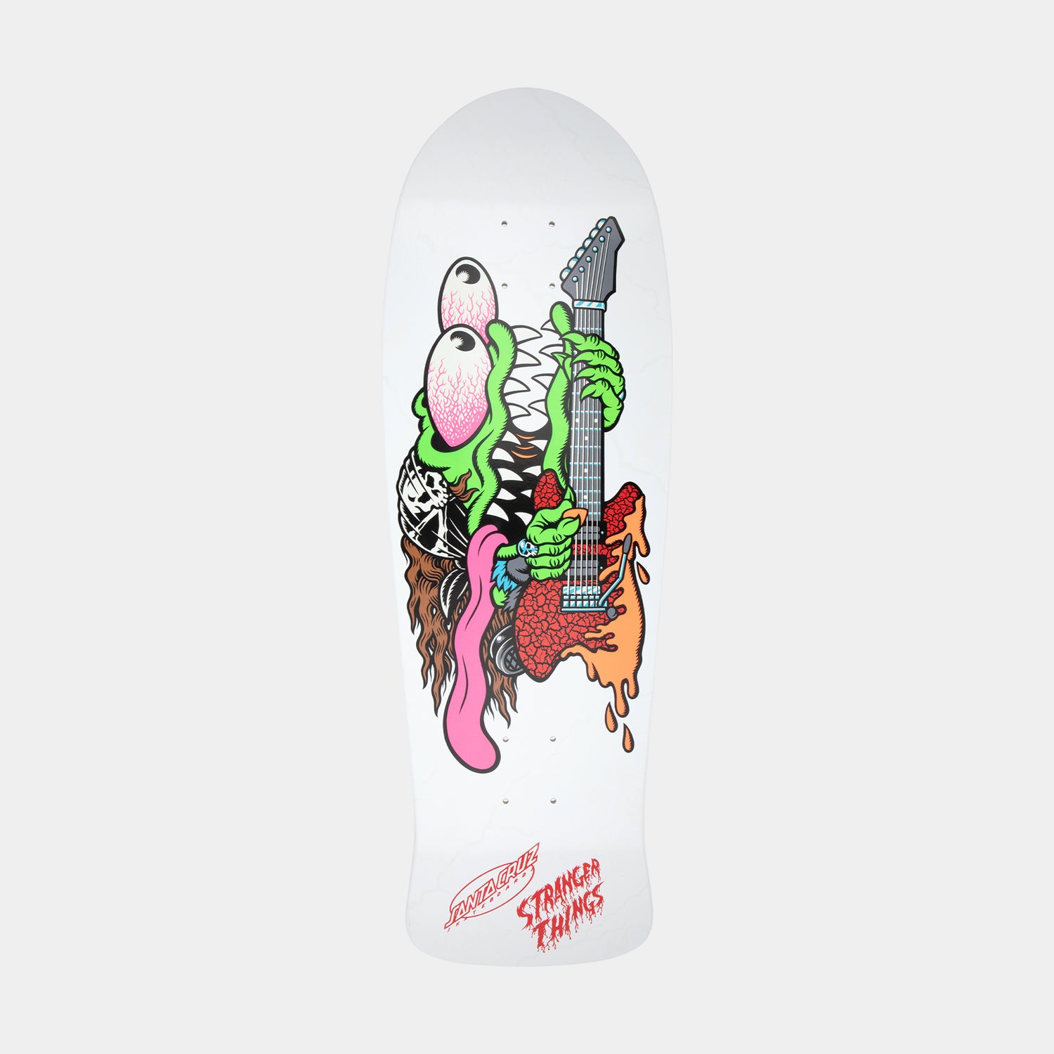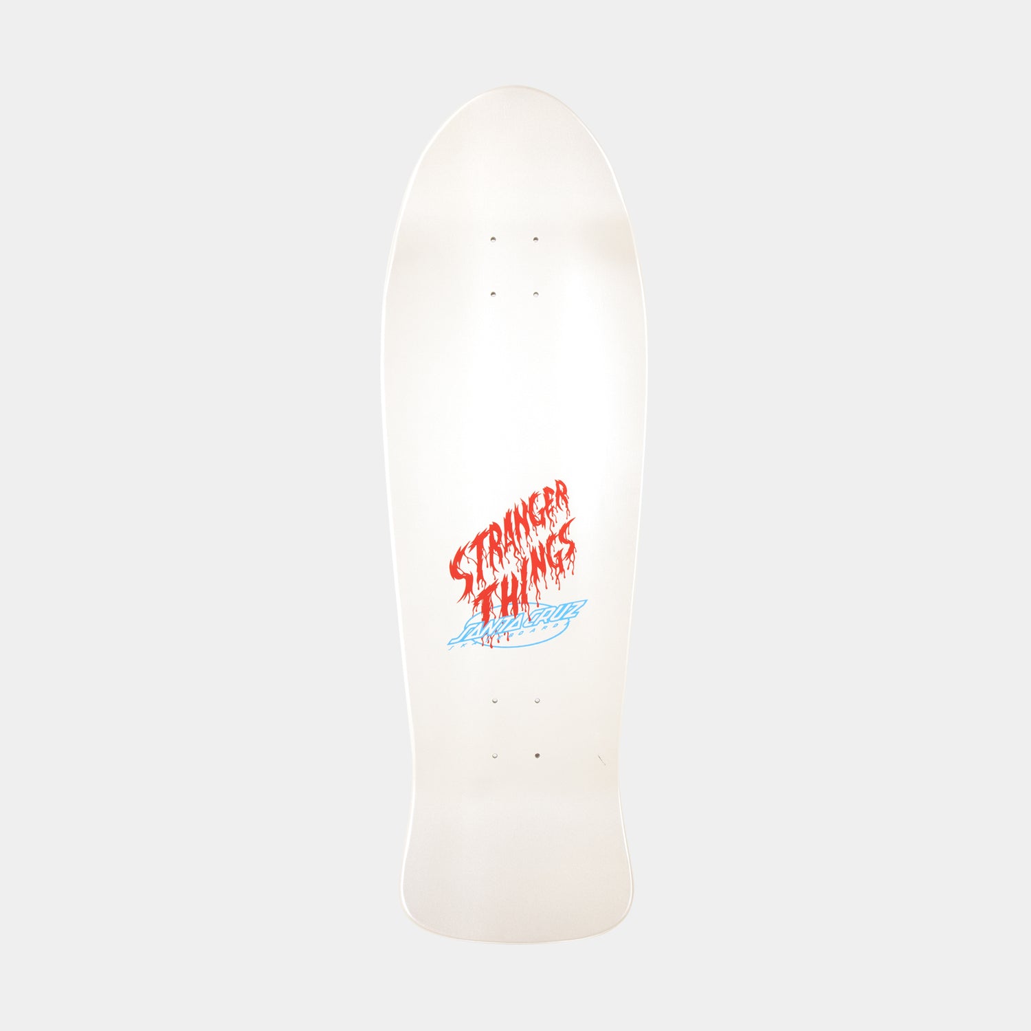 The Santa Cruz Stranger Things Meek Slasher Eddie 10.1in x 31.13in deck features multicolor glow in the dark graphics on Keith Meek's classic Slasher shape.